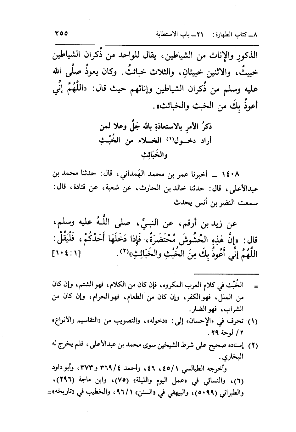 1408 - أَخْبَرَنَا عُمَرُ بْنُ مُحَمَّدٍ الْهَمْدَانِيُّ، قَالَ: حَدَّثَنَا مُحَمَّدُ بْنُ عَبْدِ الْأَعْلَى، قَالَ: حَدَّثَنَا خَالِدُ بْنُ الْحَارِثِ، عَنْ شُعْبَةَ، عَنْ قَتَادَةَ، قَالَ: سَمِعْتُ النَّضْرَ بْنَ أَنَسٍ يُحَدِّثُ عَنْ زَيْدِ بْنِ أَرْقَمَ، عَنِ النَّبِيِّ صَلَّى اللَّهُ عَلَيْهِ وَسَلَّمَ، قَالَ: «إِنَّ هَذِهِ الْحُشُوشَ مُحْتَضَرَةٌ، فَإِذَا دَخَلَهَا أَحَدُكُمْ، فَلْيَقُلْ: اللَّهُمَّ إِنِّي أَعُوذُ بِكَ مِنَ الْخُبُثِ، وَالْخَبَائِثِ» (¬2) . [1: 104]