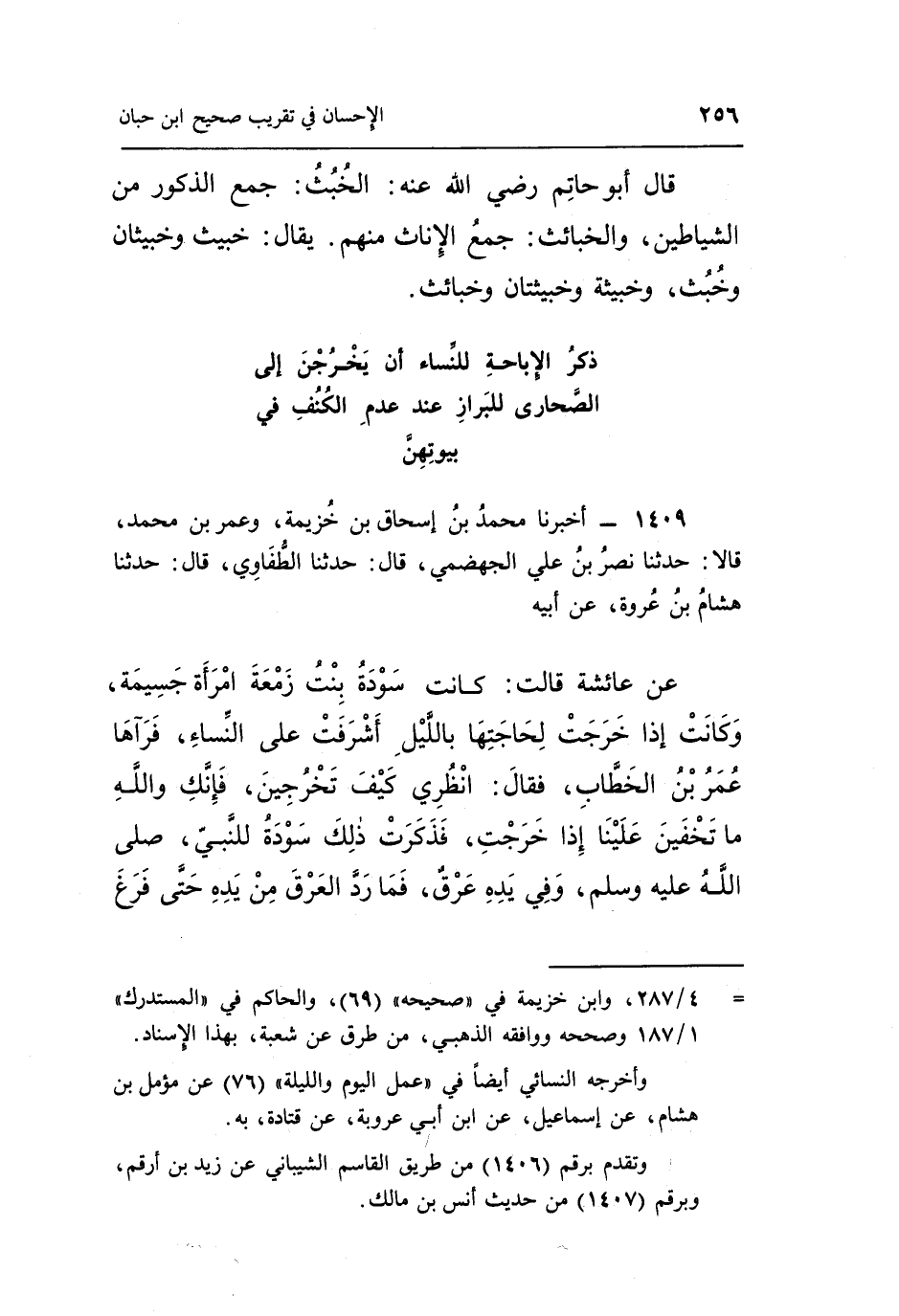 1409 - أَخْبَرَنَا مُحَمَّدُ بْنُ إِسْحَاقَ بْنِ خُزَيْمَةَ، وَعُمَرُ بْنُ مُحَمَّدٍ قَالَا: حَدَّثَنَا نَصْرُ بْنُ عَلِيٍّ الْجَهْضَمِيُّ، قَالَ: حَدَّثَنَا الطُّفَاوِيُّ، قَالَ: حَدَّثَنَا هِشَامُ بْنُ عُرْوَةَ، عَنْ أَبِيهِ، عَنْ عَائِشَةَ، قَالَتْ: كَانَتْ سَوْدَةُ بِنْتُ زَمْعَةَ امْرَأَةً جَسِيمَةً، وَكَانَتْ إِذَا خَرَجَتْ لِحَاجَتِهَا بِاللَّيْلِ أَشْرَفَتْ عَلَى النِّسَاءِ، فَرَآهَا عُمَرُ بْنُ الْخَطَّابِ، فَقَالَ: انْظُرِي كَيْفَ تَخْرُجِينَ فَإِنَّكِ وَاللَّهِ مَا تَخْفَيْنَ عَلَيْنَا إِذَا خَرَجْتِ، فَذَكَرَتْ ذَلِكَ سَوْدَةُ لِلنَّبِيِّ صَلَّى اللَّهُ عَلَيْهِ وَسَلَّمَ وَفِي يَدِهِ عَرْقٌ، فَمَا رَدَّ الْعَرْقَ مِنْ يَدِهِ حَتَّى فَرَغَ
