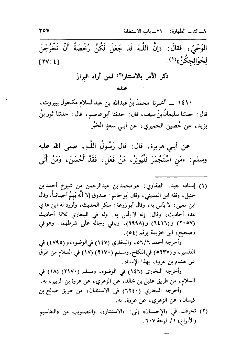 (¬1) إسناده جيد. الطفاوي: هو محمد بن عبد الرحمن من شيوخ أحمد بن حنبل، وثقة ابن المديني، وقال أبو حاتم: صدوق إلا أنه يَهِمُ أحيانا، وقال ابن معين: لا بأس به، وقال أبو زرعة: منكر الحديث، وأورد له ابن عدي عدة أحاديث، وقال: إنه لا بأس به. وله في البخاري ثلاثة أحاديث (2057) و (6416) و (6998) ، وباقي رجاله على شرطهما. وهو في " صحيح " ابن خزيمة برقم (54) .