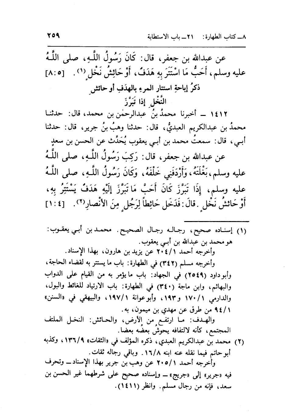عَنْ عَبْدِ اللَّهِ بْنِ جَعْفَرٍ، قَالَ: «كَانَ رَسُولُ اللَّهِ صَلَّى اللَّهُ عَلَيْهِ وَسَلَّمَ أَحَبُّ مَا اسْتَتَرَ بِهِ هَدَفٌ أَوْ حَائِشُ نَخْلٍ» (¬1) . [5: 8]