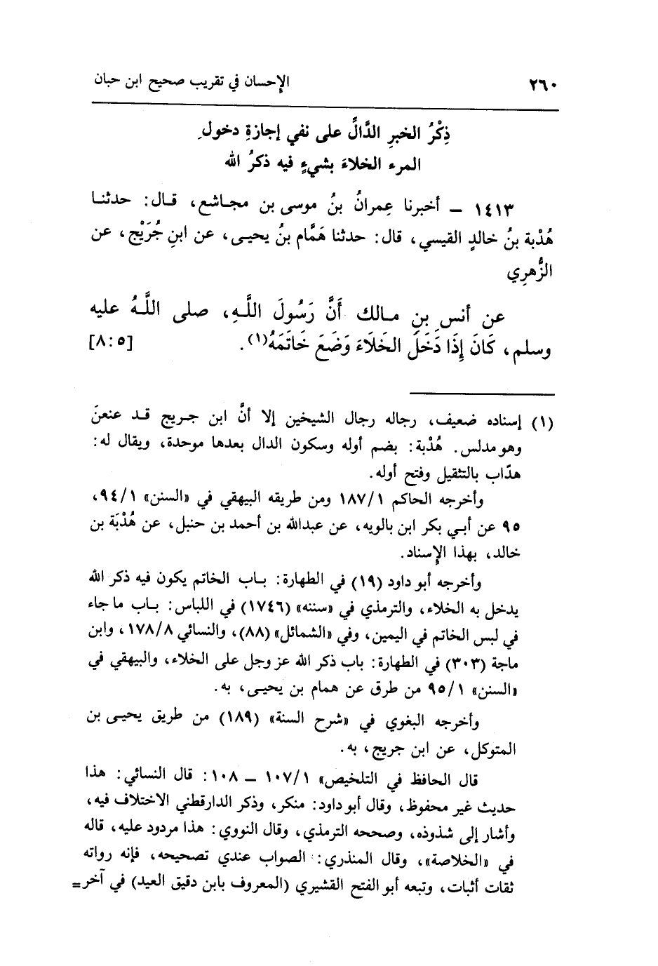 1413 - أَخْبَرَنَا عِمْرَانُ بْنُ مُوسَى بْنِ مُجَاشِعٍ، قَالَ: حَدَّثَنَا هُدْبَةُ بْنُ خَالِدٍ الْقَيْسِيُّ، قَالَ: حَدَّثَنَا هَمَّامُ بْنُ يَحْيَى، عَنِ ابْنِ جُرَيْجٍ، عَنِ الزُّهْرِيِّ، عَنْ أَنَسِ بْنِ مَالِكٍ: «أَنَّ رَسُولَ اللَّهِ صَلَّى اللَّهُ عَلَيْهِ وَسَلَّمَ كَانَ إِذَا دَخَلَ الْخَلَاءَ وَضَعَ خَاتَمَهُ» (¬1) . [5: 8]