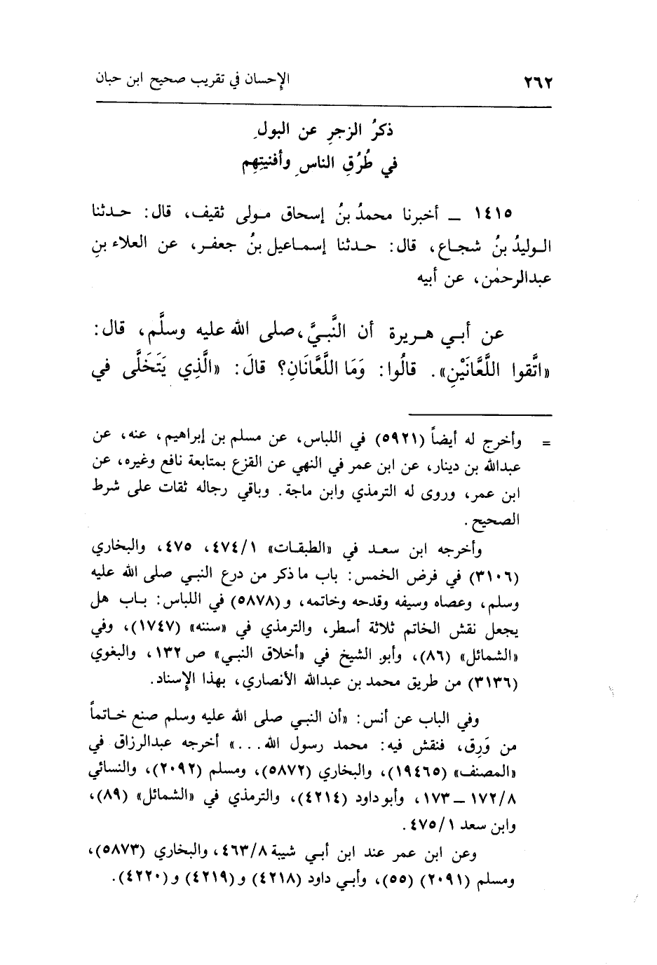 1415 - أَخْبَرَنَا مُحَمَّدُ بْنُ إِسْحَاقَ، مَوْلَى ثَقِيفٍ، قَالَ: حَدَّثَنَا الْوَلِيدُ بْنُ شُجَاعٍ، قَالَ: حَدَّثَنَا إِسْمَاعِيلُ بْنُ جَعْفَرٍ، عَنِ الْعَلَاءِ بْنِ عَبْدِ الرَّحْمَنِ، عَنْ أَبِيهِ، عَنْ أَبِي هُرَيْرَةَ، أَنَّ النَّبِيَّ صَلَّى اللَّهُ عَلَيْهِ وَسَلَّمَ، قَالَ: «اتَّقُوا اللَّعَّانَيْنِ» ، قَالُوا: وَمَا اللَّعَّانَانِ؟ قَالَ: «الَّذِي يَتَخَلَّى فِي