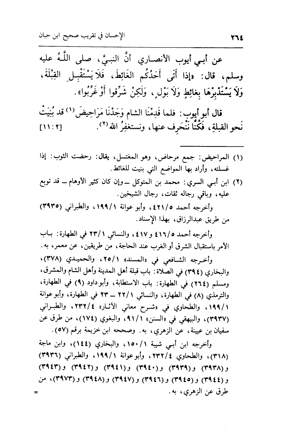 قَالَ أَبُو أَيُّوبَ: «فَلَمَّا قَدِمْنَا الشَّامَ وَجَدْنَا مَرَاحِيضَ (¬1) قَدْ بُنِيَتْ نَحْوَ الْقِبْلَةِ، فَكُنَّا نَنْحَرِفُ عَنْهَا وَنَسْتَغْفِرُ اللَّهَ» (¬2) . [2: 11]