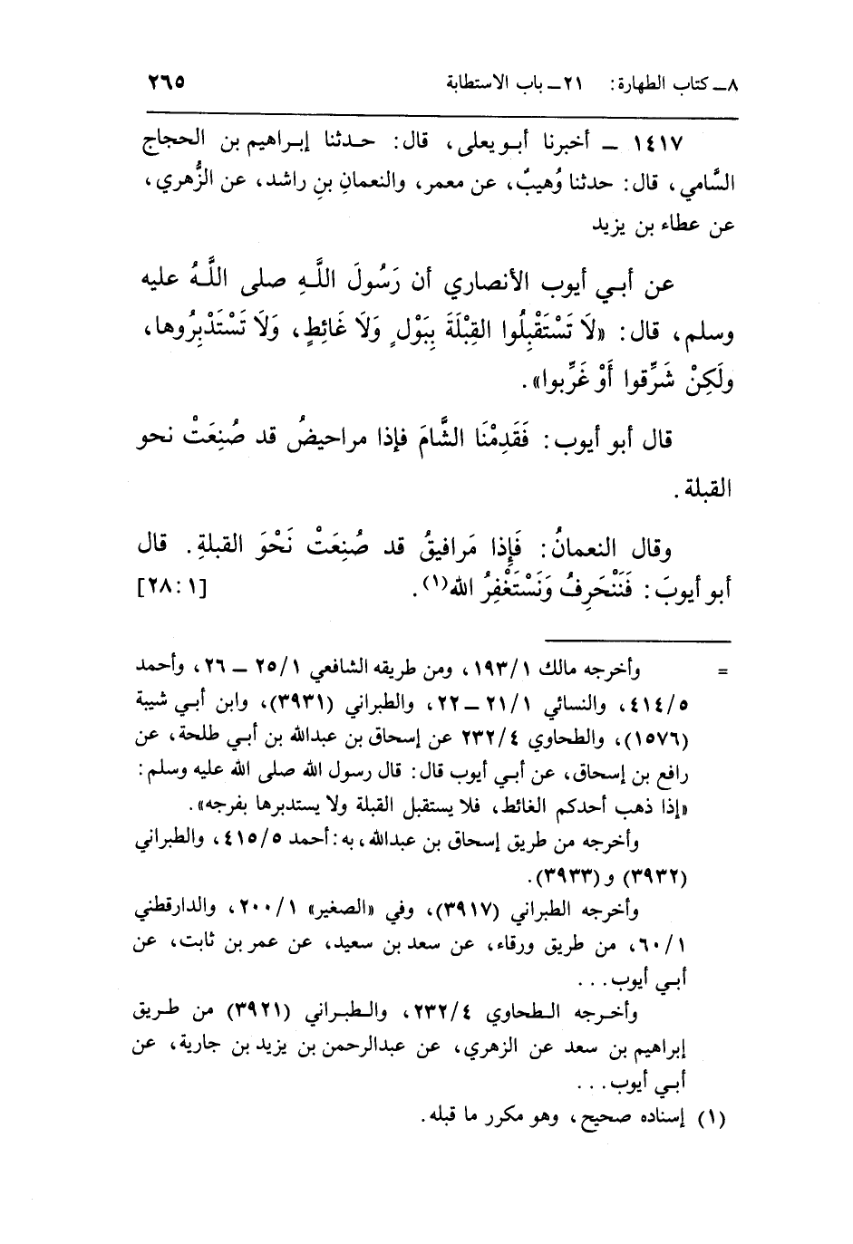 1417 - أَخْبَرَنَا أَبُو يَعْلَى، قَالَ: حَدَّثَنَا إِبْرَاهِيمُ بْنُ الْحَجَّاجِ السَّامِيُّ، قَالَ: حَدَّثَنَا وُهَيْبٌ، عَنْ مَعْمَرٍ، وَالنُّعْمَانِ بْنِ رَاشِدٍ، عَنِ الزُّهْرِيِّ، عَنْ عَطَاءِ بْنِ يَزِيدَ، عَنْ أَبِي أَيُّوبَ الْأَنْصَارِيِّ، أَنَّ رَسُولَ اللَّهِ صَلَّى اللَّهُ عَلَيْهِ وَسَلَّمَ قَالَ: «لَا تَسْتَقْبِلُوا الْقِبْلَةَ بِبَوْلٍ، وَلَا غَائِطٍ، وَلَا تَسْتَدْبِرُوهَا، وَلَكِنْ شَرِّقُوا أَوْ غَرِّبُوا»