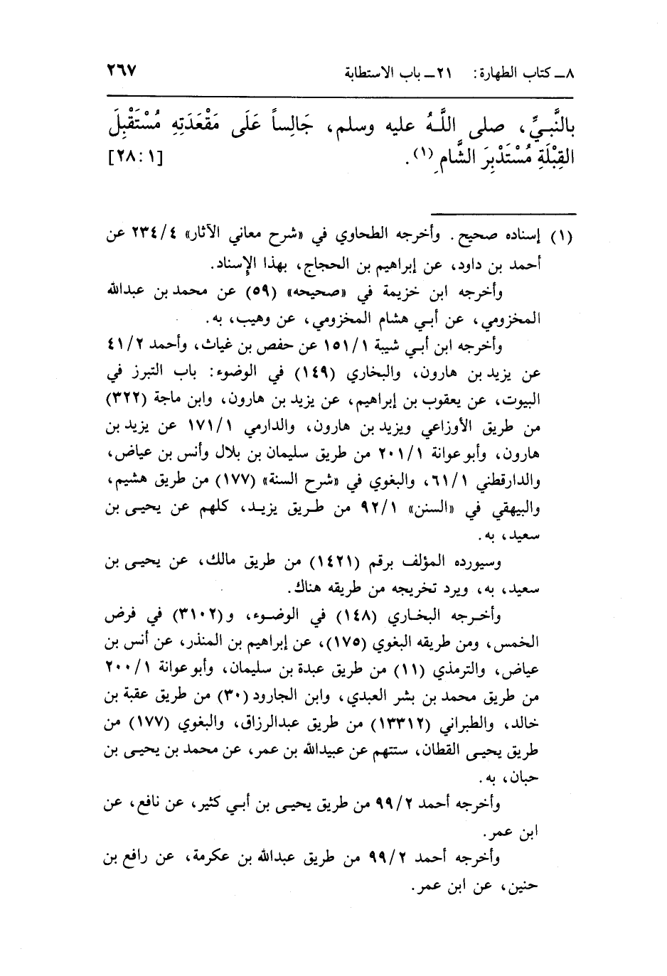 بِالنَّبِيِّ صَلَّى اللهُ عَلَيْهِ وَسَلَّمَ جَالِسًا عَلَى مَقْعَدَتِهِ مُسْتَقْبِلَ الْقِبْلَةِ، مُسْتَدْبِرَ الشَّامِ» (¬1) . [1: 28]