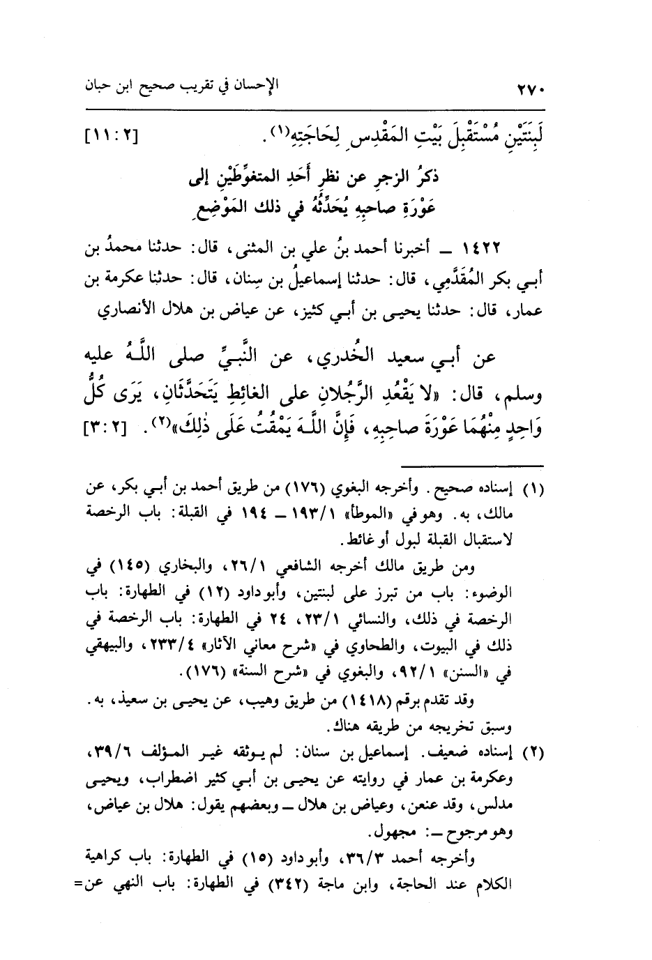 1422 - أَخْبَرَنَا أَحْمَدُ بْنُ عَلِيِّ بْنِ الْمُثَنَّى، قَالَ: حَدَّثَنَا مُحَمَّدُ بْنُ أَبِي بَكْرٍ الْمُقَدَّمِيُّ، قَالَ: حَدَّثَنَا إِسْمَاعِيلُ بْنُ سِنَانٍ، قَالَ: حَدَّثَنَا عِكْرِمَةُ بْنُ عَمَّارٍ، قَالَ: حَدَّثَنَا يَحْيَى بْنُ أَبِي كَثِيرٍ، عَنْ عِيَاضِ بْنِ هِلَالٍ الْأَنْصَارِيِّ، عَنْ أَبِي سَعِيدٍ الْخُدْرِيِّ، عَنِ النَّبِيِّ صَلَّى اللَّهُ عَلَيْهِ وَسَلَّمَ، قَالَ: «لَا يَقْعُدِ الرَّجُلَانِ عَلَى الْغَائِطِ يَتَحَدَّثَانِ، يَرَى كُلُّ وَاحِدٍ مِنْهُمَا عَوْرَةَ صَاحِبِهِ، فَإِنَّ اللَّهَ يَمْقُتُ عَلَى ذَلِكَ» (¬2) . [2: 3]