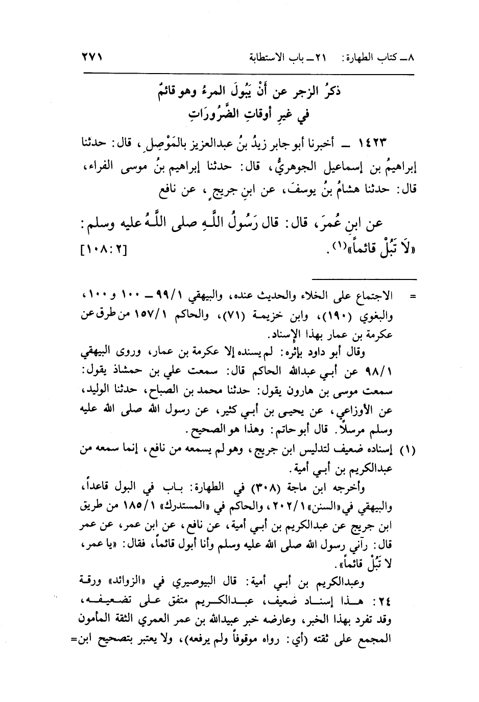 1423 - أَخْبَرَنَا أَبُو جَابِرِ زَيْدُ بْنُ عَبْدِ الْعَزِيزِ، بِالْمَوْصِلِ، قَالَ: حَدَّثَنَا إِبْرَاهِيمُ بْنُ إِسْمَاعِيلَ الْجَوْهَرِيُّ، قَالَ: حَدَّثَنَا إِبْرَاهِيمُ بْنُ مُوسَى الْفَرَّاءُ، قَالَ: حَدَّثَنَا هِشَامُ بْنُ يُوسُفَ، عَنِ ابْنِ جُرَيْجٍ، عَنْ نَافِعٍ، عَنِ ابْنِ عُمَرَ، قَالَ: قَالَ رَسُولُ اللَّهِ صَلَّى اللَّهُ عَلَيْهِ وَسَلَّمَ: «لَا تَبُلْ قَائِمًا» (¬1) . [2: 108]