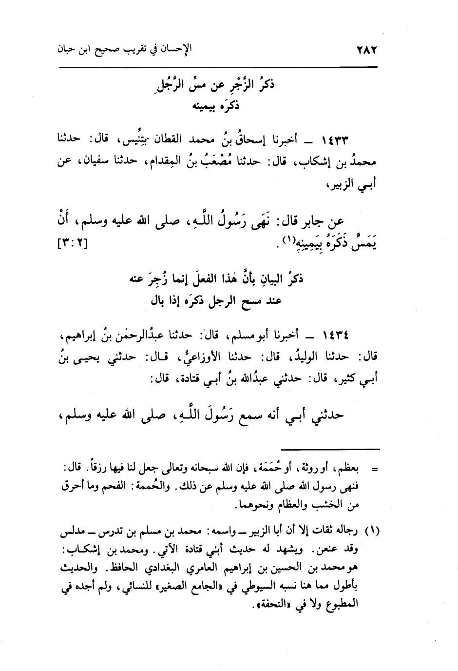 1433 - أَخْبَرَنَا إِسْحَاقُ بْنُ مُحَمَّدٍ الْقَطَّانُ، بِتِنِّيسَ، قَالَ: حَدَّثَنَا مُحَمَّدُ بْنُ إِشْكَابَ، قَالَ: حَدَّثَنَا مُصْعَبُ بْنُ الْمِقْدَامِ، حَدَّثَنَا سُفْيَانُ، عَنْ أَبِي الزُّبَيْرِ، عَنْ جَابِرٍ، قَالَ: «نَهَى رَسُولُ اللَّهِ صَلَّى اللَّهُ عَلَيْهِ وَسَلَّمَ أَنْ يَمَسَّ الرَّجُلُ ذَكَرَهُ بِيَمِينِهِ» (¬1) . [2: 3]