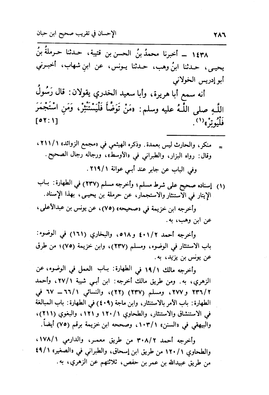1438 - أَخْبَرَنَا مُحَمَّدُ بْنُ الْحَسَنِ بْنِ قُتَيْبَةَ، حَدَّثَنَا حَرْمَلَةُ بْنُ يَحْيَى، حَدَّثَنَا ابْنُ وَهْبٍ، حَدَّثَنَا يُونُسُ، عَنِ ابْنِ شِهَابٍ، أَخْبَرَنِي أَبُو إِدْرِيسَ الْخَوْلَانِيُّ، أَنَّهُ سَمِعَ أَبَا هُرَيْرَةَ، وَأَبَا سَعِيدٍ الْخُدْرِيَّ، يَقُولَانِ: قَالَ رَسُولُ اللَّهِ صَلَّى اللَّهُ عَلَيْهِ وَسَلَّمَ: «مَنْ تَوَضَّأَ فَلْيَسْتَنْثِرْ، وَمَنِ اسْتَجْمَرَ فَلْيُوتِرْ» (¬1) . [1: 52]