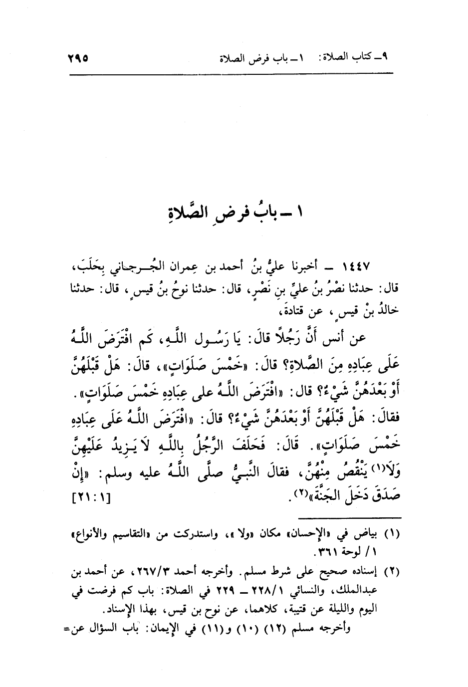 عَنْ أَنَسٍ أَنَّ رَجُلًا قَالَ: يَا رَسُولَ اللَّهِ كَمِ افْتَرَضَ اللَّهُ عَلَى عِبَادِهِ مِنَ الصَّلَاةِ؟ قَالَ: "خَمْسُ صَلَوَاتٍ" قَالَ: هَلْ قَبْلَهُنَّ أَوْ بَعْدَهُنَّ شَيْءٌ قَالَ: "افْتَرَضَ اللَّهُ عَلَى عِبَادِهِ خَمْسَ صَلَوَاتٍ" فَقَالَ هَلْ قَبْلَهُنَّ أَوْ بَعْدَهُنَّ شَيْءٌ؟ قَالَ: "افْتَرَضَ اللَّهُ عَلَى عِبَادِهِ خَمْسَ صَلَوَاتٍ" قَالَ: فَحَلَفَ الرَّجُلُ بِاللَّهِ لَا1 يَزِيدُ عَلَيْهِنَّ وَلَا يَنْقُصُ مِنْهُنَّ فَقَالَ: النَّبِيُّ صَلَّى اللَّهُ عَلَيْهِ وَسَلَّمَ: "إِنَّ صدق دخل الجنة" 2.