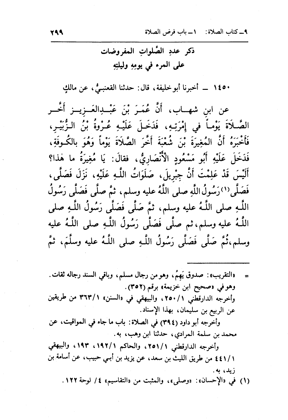 1450 - أَخْبَرَنَا أَبُو خَلِيفَةَ قَالَ حَدَّثَنَا الْقَعْنَبِيُّ عَنْ مالك عن بن شِهَابٍ أَنَّ عُمَرَ بْنَ عَبْدِ الْعَزِيزِ أَخَّرَ الصَّلَاةَ يَوْمًا فِي إِمْرَتِهِ فَدَخَلَ عَلَيْهِ عُرْوَةُ بْنُ الزُّبَيْرِ فَأَخْبَرَهُ أَنَّ الْمُغِيرَةَ بْنَ شُعْبَةَ أَخَّرَ الصَّلَاةَ يَوْمًا وَهُوَ بِالْكُوفَةِ فَدَخَلَ عَلَيْهِ أَبُو مَسْعُودٍ الْأَنْصَارِيُّ فَقَالَ يَا مُغِيرَةُ مَا هَذَا أَلَيْسَ قَدْ عَلِمْتَ أَنَّ جِبْرِيلَ صَلَوَاتُ اللَّهِ عَلَيْهِ نَزَلَ فَصَلَّى فَصَلَّى1 رَسُولِ اللَّهِ صَلَّى اللَّهُ عَلَيْهِ وَسَلَّمَ ثُمَّ صَلَّى فَصَلَّى رَسُولِ اللَّهِ صَلَّى اللَّهُ عَلَيْهِ وَسَلَّمَ ثُمَّ صَلَّى فَصَلَّى رَسُولِ اللَّهِ صَلَّى اللَّهُ عَلَيْهِ وَسَلَّمَ ثُمَّ صَلَّى فَصَلَّى رَسُولِ اللَّهِ صَلَّى اللَّهُ عَلَيْهِ وَسَلَّمَ ثُمَّ صَلَّى فَصَلَّى رَسُولِ اللَّهِ صَلَّى اللَّهُ عَلَيْهِ وَسَلَّمَ ثُمَّ