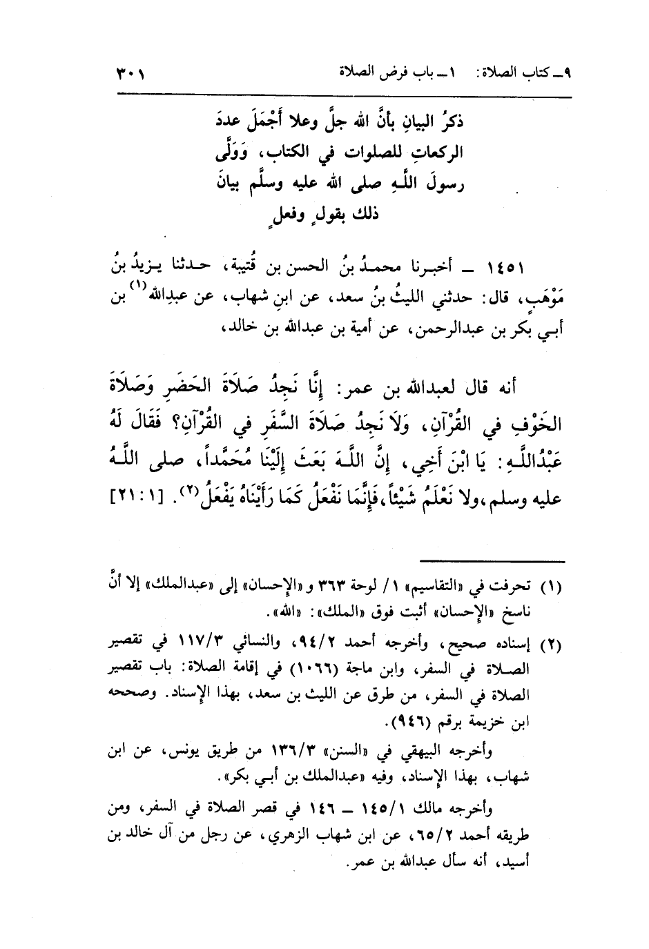 2 إسناده صحيح، وأخرجه أحمد 2/94، والنسائي 3/117 في تقصير الصلاة في السفر، وابن ماجة [1066] في إقامة الصلاة: باب تقصير الصلاة في السفر، من طرق عن الليث بن سعد، بهذا الإسناد. وصححه ابن خزيمة برقم [946] .