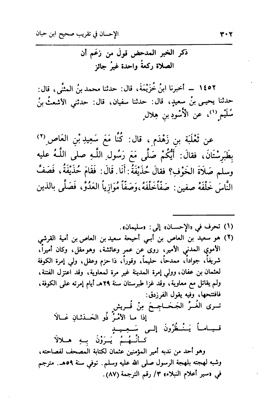 عَنْ ثَعْلَبَةَ بْنِ زَهْدَمٍ قَالَ كُنَّا مَعَ سَعِيدِ بْنِ الْعَاصِ2 بِطَبَرِسْتَانَ فَقَالَ أَيُّكُمْ صَلَّى مَعَ رَسُولِ اللَّهِ صَلَّى اللَّهُ عَلَيْهِ وَسَلَّمَ صَلَاةَ الْخَوْفِ فَقَالَ حُذَيْفَةُ أَنَا قَالَ فَقَامَ حُذَيْفَةُ فَصَفَّ النَّاسَ خَلْفَهُ صِفِّينَ صَفًّا خَلْفَهُ وَصَفًّا مُوَازِيًا لِلْعَدُوِّ فَصَلَّى بِالَّذِينَ