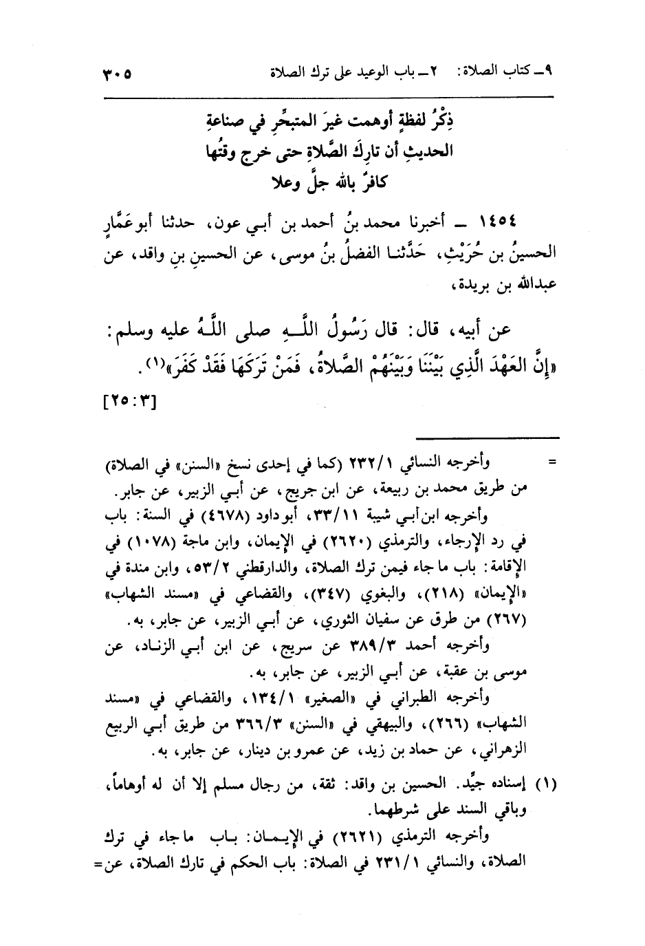 وأخرجه الترمذي [2621] في الإيمان: باب ما جاء في ترك الصلاة، والنسائي 1/231 في الصلاة: باب الحكم في تارك الصلاة، عن =