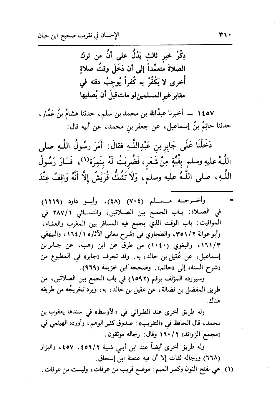 1457 - أَخْبَرَنَا عَبْدُ اللَّهِ بْنُ مُحَمَّدِ بْنِ سَلْمٍ حَدَّثَنَا هِشَامُ بْنُ عَمَّارٍ حَدَّثَنَا حَاتِمُ بْنُ إِسْمَاعِيلَ عَنْ جَعْفَرِ بْنِ مُحَمَّدٍ عَنْ أَبِيهِ قَالَ: