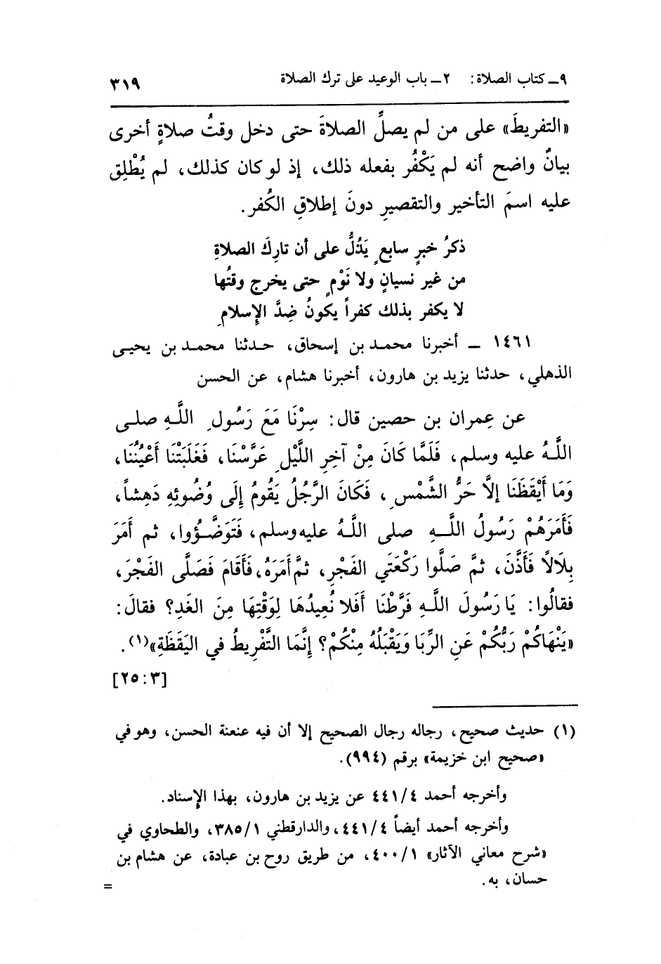 عَنْ عِمْرَانَ بْنِ حُصَيْنٍ قَالَ سِرْنَا مَعَ رَسُولِ اللَّهِ صَلَّى اللَّهُ عَلَيْهِ وَسَلَّمَ فَلَمَّا كَانَ مِنْ آخِرِ اللَّيْلِ عَرَّسْنَا فَغَلَبَتْنَا أَعْيُنُنَا وَمَا أَيْقَظَنَا إِلَّا حَرُّ الشَّمْسِ فَكَانَ الرَّجُلُ يَقُومُ إِلَى وَضُوئِهِ دَهِشًا فَأَمَرَهُمْ رَسُولُ اللَّهِ صَلَّى اللَّهُ عَلَيْهِ وَسَلَّمَ فتوضؤوا ثُمَّ أَمَرَ بِلَالًا فَأَذَّنَ ثُمَّ صَلُّوا رَكْعَتَيِ الْفَجْرِ ثُمَّ أَمَرَهُ فَأَقَامَ فَصَلَّى الْفَجْرَ فَقَالُوا يَا رَسُولَ اللَّهِ فَرَّطْنَا أَفَلَا نُعِيدُهَا لِوَقْتِهَا مِنَ الْغَدِ فَقَالَ: "يَنْهَاكُمْ رَبُّكُمْ عَنِ الرِّبَا ويقبله منكم إنما التفريط في اليقظة" 1.