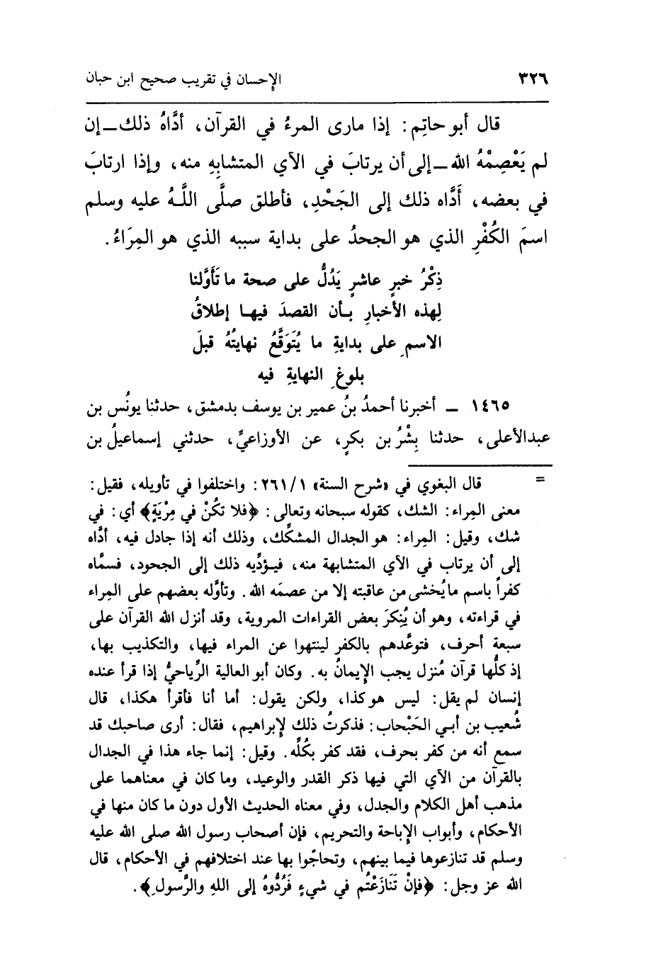 قَالَ أَبُو حَاتِمٍ إِذَا مَارَى الْمَرْءُ فِي الْقُرْآنِ أَدَّاهُ ذَلِكَ إِنْ لَمْ يَعْصِمْهُ اللَّهُ إِلَى أَنْ يَرْتَابَ فِي الْآيِ الْمُتَشَابِهِ مِنْهُ وَإِذَا ارْتَابَ فِي بَعْضِهِ أَدَّاهُ ذَلِكَ إِلَى الْجَحْدِ فَأَطْلَقَ صَلَّى اللَّهُ عَلَيْهِ وَسَلَّمَ اسْمَ الْكُفْرِ الَّذِي هُوَ الْجَحْدُ عَلَى بِدَايَةِ سَبَبِهِ الذي هو المراء.
