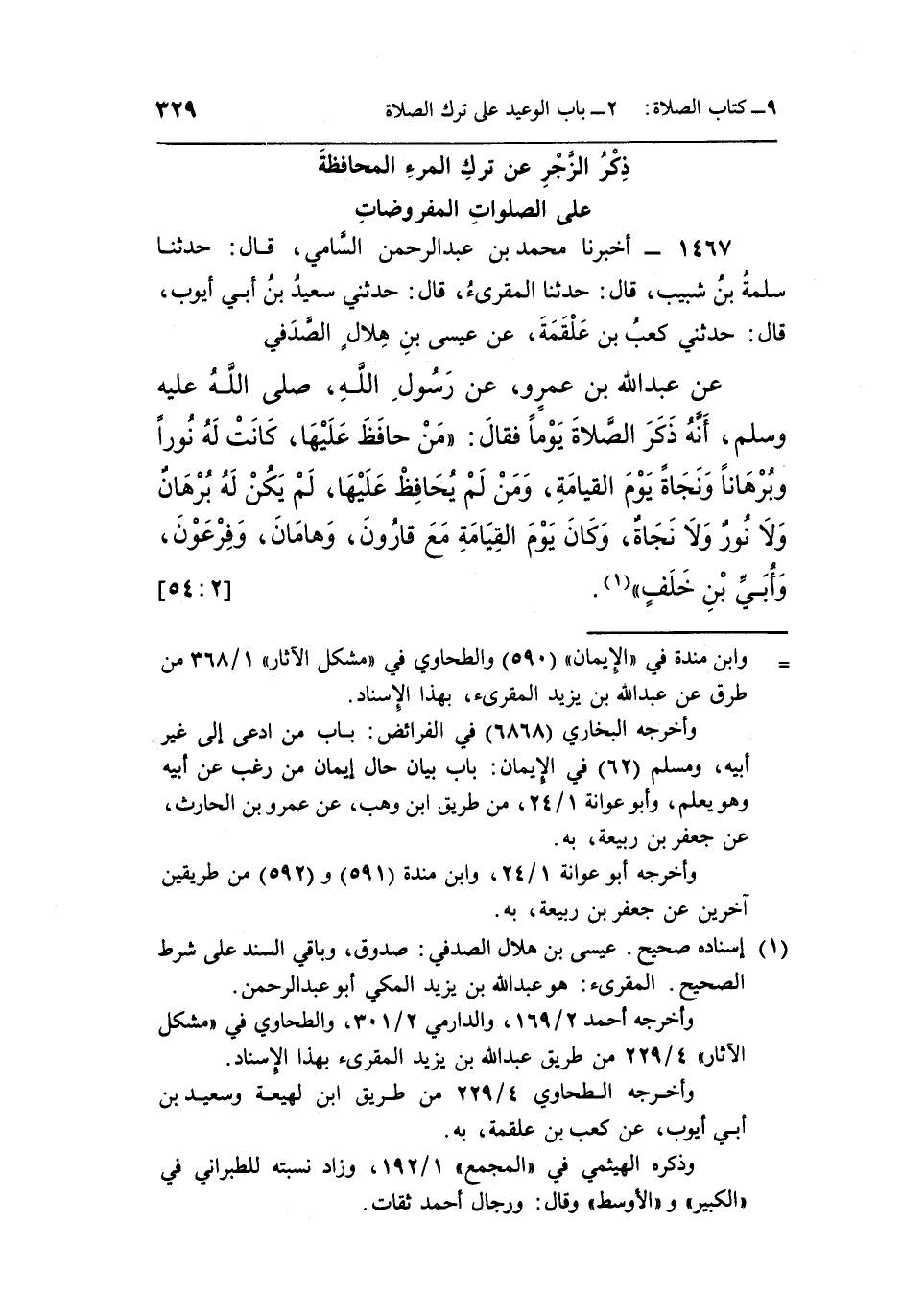 عَنْ عَبْدِ اللَّهِ بْنِ عَمْرٍو عَنْ رَسُولِ اللَّهِ صَلَّى اللَّهُ عَلَيْهِ وَسَلَّمَ أَنَّهُ ذَكَرَ الصَّلَاةَ يَوْمًا فَقَالَ: "مَنْ حَافَظَ عَلَيْهَا كَانَتْ لَهُ نُورًا وَبُرْهَانًا وَنَجَاةً يَوْمَ الْقِيَامَةِ وَمَنْ لَمْ يُحَافِظْ عَلَيْهَا لَمْ يَكُنْ لَهُ بُرْهَانٌ وَلَا نُورٌ وَلَا نَجَاةٌ وَكَانَ يَوْمَ الْقِيَامَةِ مَعَ قَارُونَ وَهَامَانَ وَفِرْعَوْنَ وَأُبَيِّ بن خلف" 1.