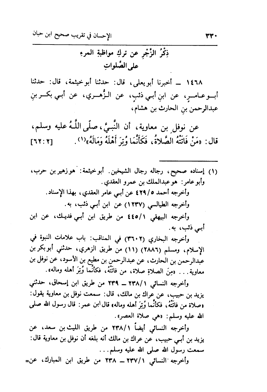 عَنْ نَوْفَلِ بْنِ مُعَاوِيَةَ أَنَّ النَّبِيَّ صَلَّى اللَّهُ عَلَيْهِ وَسَلَّمَ قَالَ: "مَنْ فَاتَتْهُ الصَّلَاةُ فكأنما وتر أهله وماله" 1.