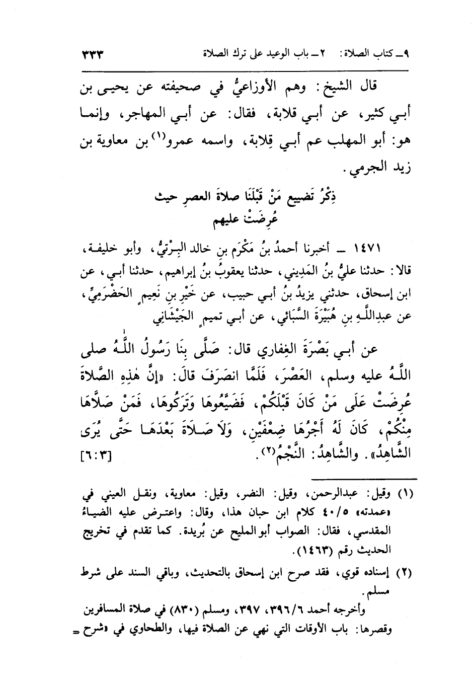 عَنْ أَبِي بَصْرَةَ الْغِفَارِيِّ قَالَ: صَلَّى بِنَا رَسُولُ اللَّهِ صَلَّى اللَّهُ عَلَيْهِ وَسَلَّمَ الْعَصْرَ فَلَمَّا انْصَرَفَ قَالَ: "إِنَّ هَذِهِ الصَّلَاةَ عُرِضَتْ عَلَى مَنْ كَانَ قَبْلَكُمْ فَضَيَّعُوهَا وَتَرَكُوهَا فَمَنْ صَلَّاهَا مِنْكُمْ كَانَ لَهُ أَجْرُهَا ضِعْفَيْنِ وَلَا صَلَاةَ بَعْدَهَا حَتَّى يَرَى الشَّاهِدَ". وَالشَّاهِدُ: النَّجْمُ2.