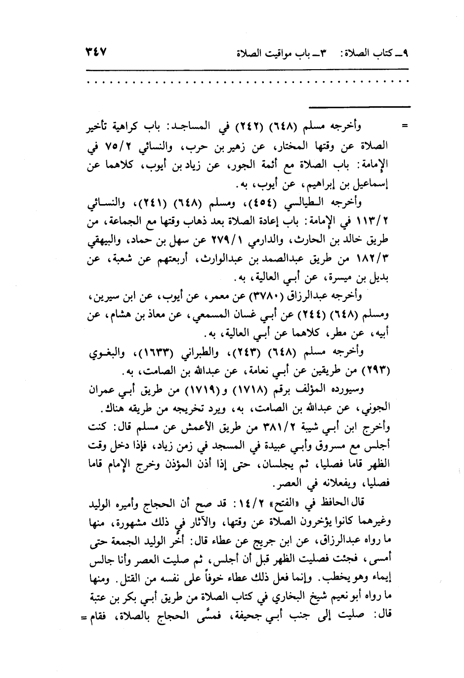 قال الحافظ في "الفتح" 2/14: قد صح أن الحجاج وأميره الوليد وغيرهما كانوا يؤخرون الصلاة عن وقتها، والآثار في ذلك مشهورة، منها ما رواه عبد الرزاق، عن ابن جريج عن عطاء قال: أخر الوليد الجمعة حتى أمسى، فجئت فصليت الظهر قبل أن أجلس، ثم صليت العصر وأنا جالس إيماء وهو يخطب. وإنما فعل ذلك عطاء خوفاً على نفسه من القتل. ومنها ما رواه أبو نعيم شيخ البخاري في كتاب الصلاة من طريق أبي بكر بن عتبة قال: صليت إلى جنب أبي جحيفة، فمسى الحجاج بالصلاة، فقام أبو جحيفة فصلى. ومن طريق ابن عمر أنه كان يصلي مع الحجاج، فلما أخر الصلاة ترك أن يشهدها محمد بن أبي إسماعيل قال: كنت بمنى وصحف تقرأ للوليد، فأخروا الصلاة، فنظرت إلى سعيد بن جبير وعطاء يومئان إيماء وهما قاعدان. وانظر مصنف ابن أبي شيبة 2/380-382، وعبد الرزاق 2/379.