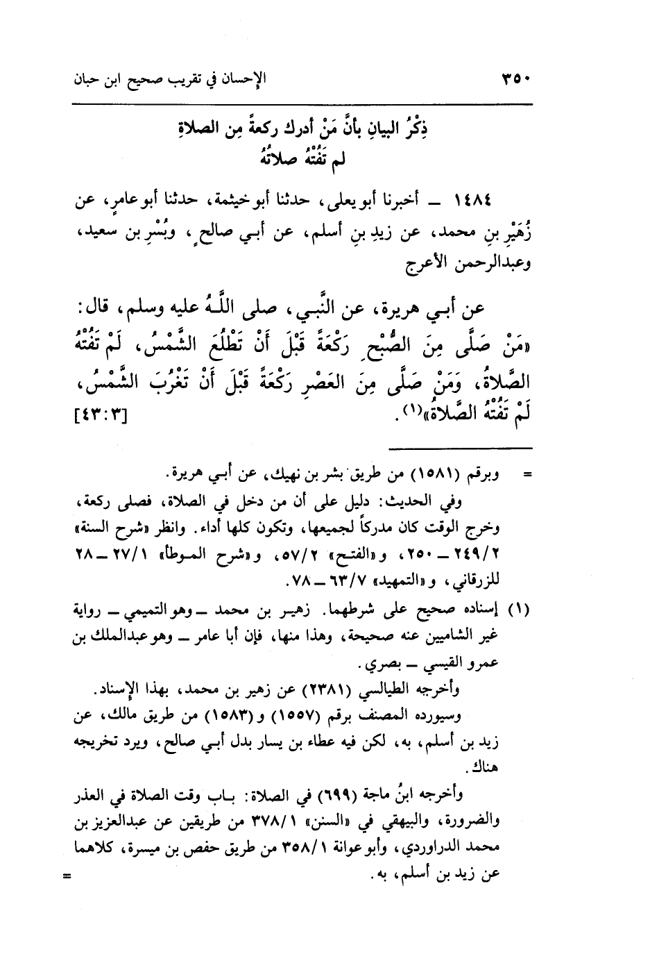 عَنْ أَبِي هُرَيْرَةَ عَنِ النَّبِيِّ صَلَّى اللَّهُ عَلَيْهِ وَسَلَّمَ قَالَ: "مَنْ صَلَّى مِنَ الصُّبْحِ رَكْعَةً قَبْلَ أَنْ تَطْلُعَ الشَّمْسُ لَمْ تَفُتْهُ الصَّلَاةُ وَمَنْ صَلَّى مِنَ الْعَصْرِ رَكْعَةً قَبْلَ أَنْ تَغْرُبَ الشَّمْسُ لَمْ تَفُتْهُ الصلاة" 1.
