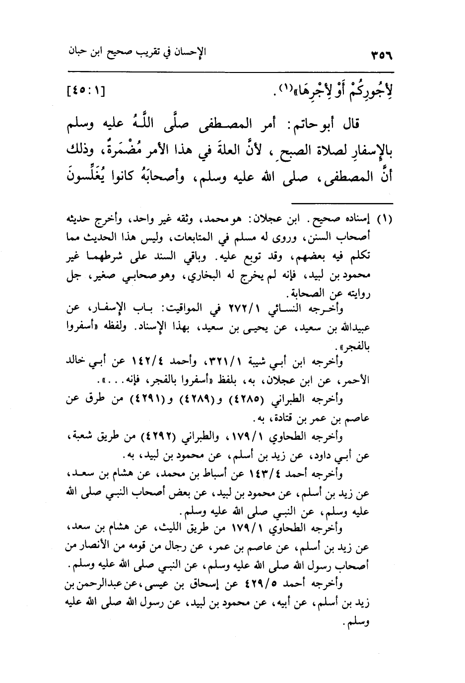 قَالَ أَبُو حَاتِمٍ أَمَرَ الْمُصْطَفَى صَلَّى اللَّهُ عَلَيْهِ وَسَلَّمَ بِالْإِسْفَارِ لِصَلَاةِ الصُّبْحِ لِأَنَّ الْعِلَّةَ فِي هَذَا الْأَمْرِ مُضْمَرَةٌ وَذَلِكَ أَنَّ الْمُصْطَفَى صَلَّى اللَّهُ عَلَيْهِ وَسَلَّمَ وأصحابه كانوا يغلسون