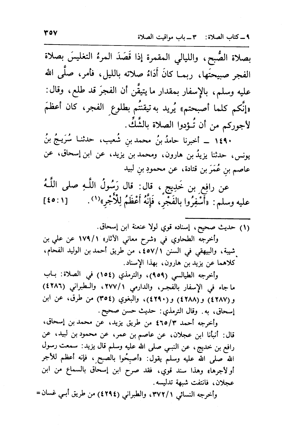وأخرجه الطيالسي [959] ، والترمذي [154] في الصلاة: باب ما جاء في الإسفار بالفجر، والدارمي 1/277، والطبراني [4286] و [4287] و [4288] و [4290] ، والبغوي [354] من طرق، عن ابن إسحاق، به. وقال الترمذي: حديث حسن صحيح.