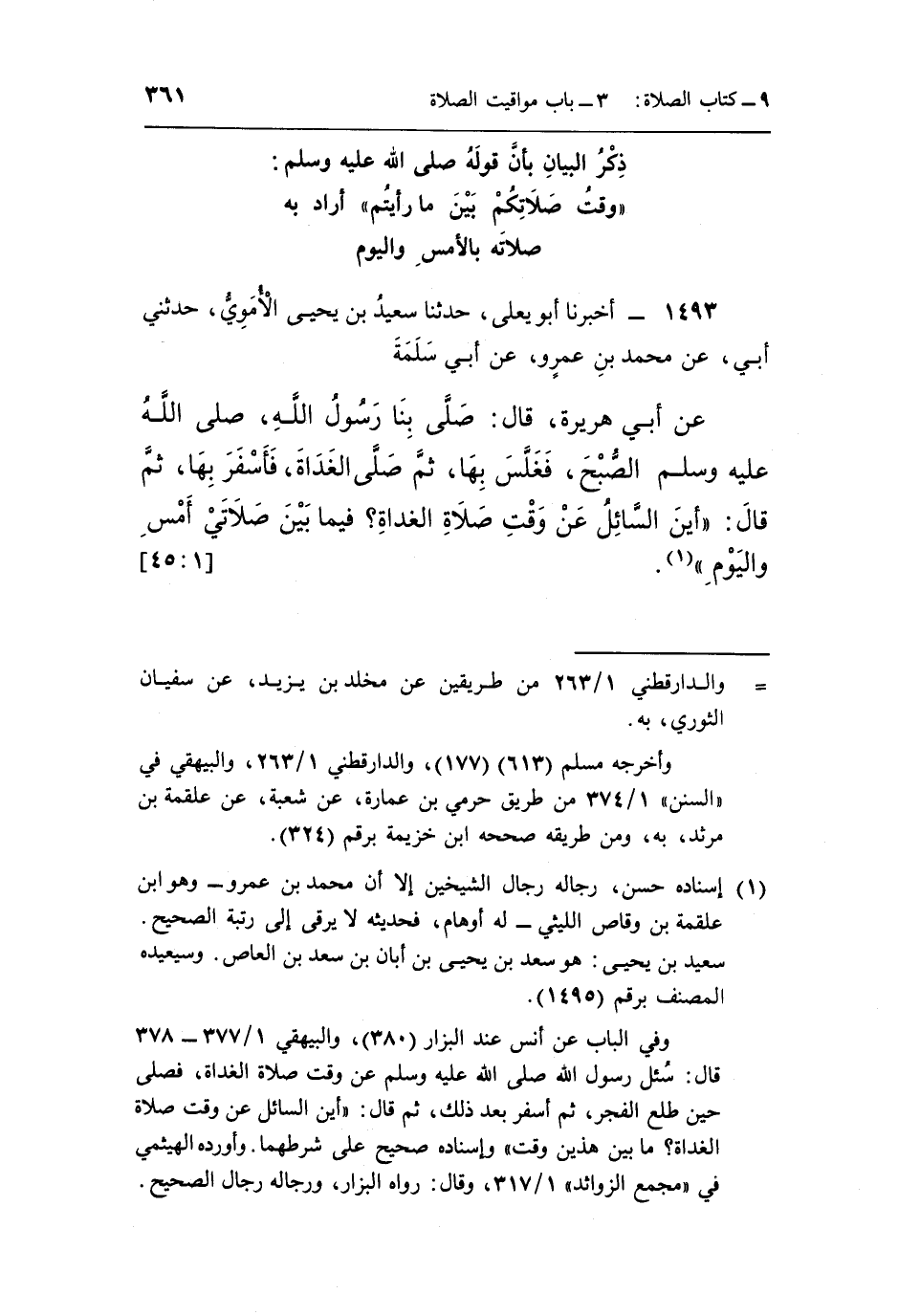عَنْ أَبِي هُرَيْرَةَ قَالَ صَلَّى بِنَا رَسُولُ اللَّهِ صَلَّى اللَّهُ عَلَيْهِ وَسَلَّمَ الصُّبْحَ فَغَلَّسَ بِهَا ثُمَّ صَلَّى الْغَدَاةَ فَأَسْفَرَ بِهَا ثُمَّ قَالَ: "أَيْنَ السَّائِلُ عَنْ وَقْتِ صَلَاةِ الْغَدَاةِ فيما بين صلاتي أمس واليوم" 1.