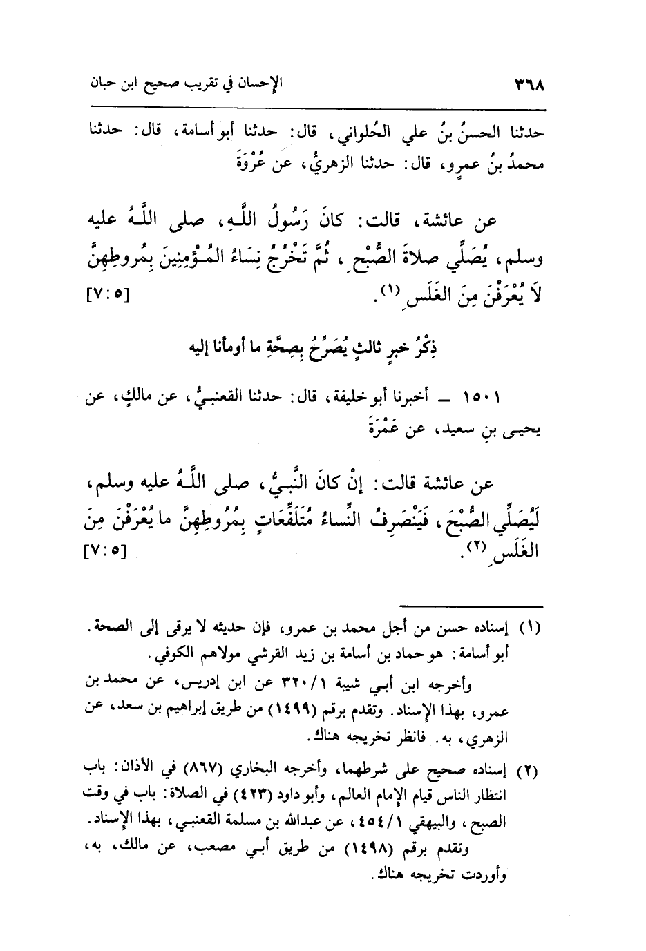 عَنْ عَائِشَةَ قَالَتْ كَانَ رَسُولُ اللَّهِ صَلَّى اللَّهُ عَلَيْهِ وَسَلَّمَ يُصَلِّي صَلَاةَ الصُّبْحِ ثُمَّ تَخْرُجُ نِسَاءُ المؤمنين بمروطهن لا يعرفن من الغلس1.