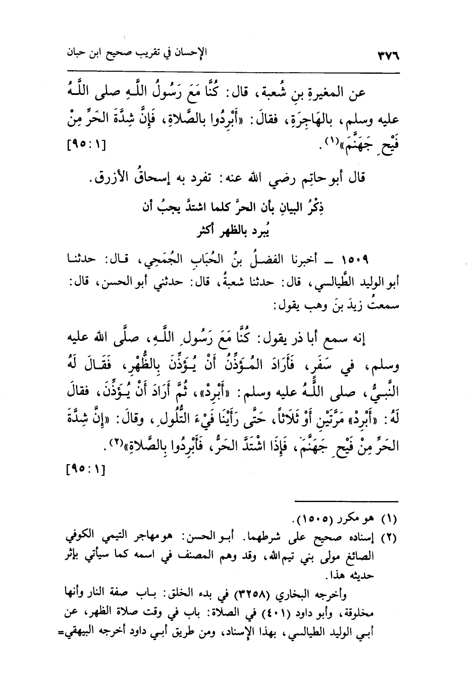 عَنِ الْمُغِيرَةِ بْنِ شُعْبَةَ قَالَ: كُنَّا مَعَ رَسُولِ اللَّهِ صَلَّى اللَّهُ عَلَيْهِ وَسَلَّمَ بِالْهَاجِرَةِ فَقَالَ: "أَبْرِدُوا بِالصَّلَاةِ فَإِنَّ شِدَّةَ الْحَرِّ مِنْ فَيْحِ جَهَنَّمَ" 1.