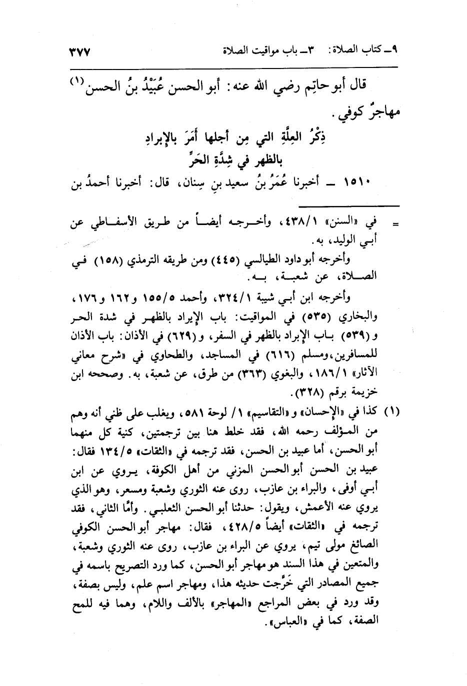1 كذا في "الإحسان" و"التقاسيم" 1/لوحة 581، ويغلب على ظني أنه وهم من المؤلف رحمه الله، فقد خلط هنا بين ترجمتين، كنية كل منهما أبو الحسن، أما عبيد بن الحسن، فقد ترجمه في "الثقات" 5/134 فقال: عبيد بن الحسن أبو الحسن المزني من أهل الكوفة، يروي عن ابن أبي أوفى، والبراء بن عازب، روى عنه الثوري وشعبة ومسعر، وهو الذي يروي عنه الأعمش، ويقول: حدثنا أبو الحسن الثعلبي. وأما الثاني، فقد ترجمه في"الثقات" أيضاً 5/428، فقال: مهاجر أبو الحسن الكوفي الصائغ مولى تيم، يروي عن البراء بن عازب، روى عنه الثوري وشعبة، والمتعين في هذا السند هو مهاجر أبو الحسن، كما ورد التصريح باسمه في جميع المصادر التي خرجت حديث هذا، ومهاجر اسم علم، وليس بصفة، وقد ورد في بعض المراجع "المهاجر" بالألف واللام، وهما فيه للمح الصفة، كما في "العباس".