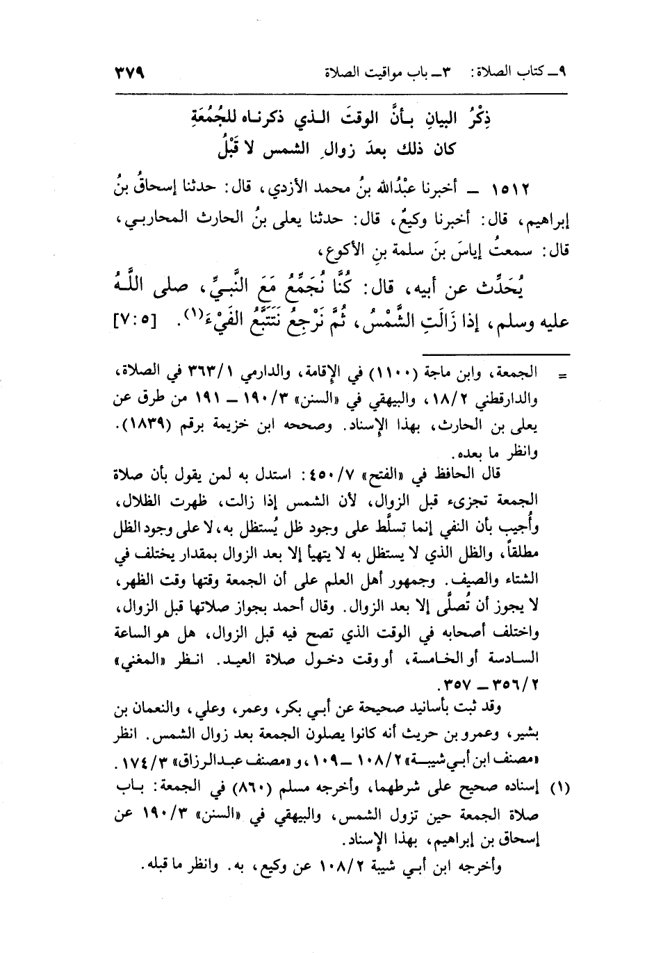 يُحَدِّثُ عَنْ أَبِيهِ قَالَ كُنَّا نُجَمِّعُ مَعَ النَّبِيِّ صَلَّى اللَّهُ عَلَيْهِ وَسَلَّمَ إِذَا زَالَتِ الشَّمْسُ ثم نرجع نتتبع الفيء1.