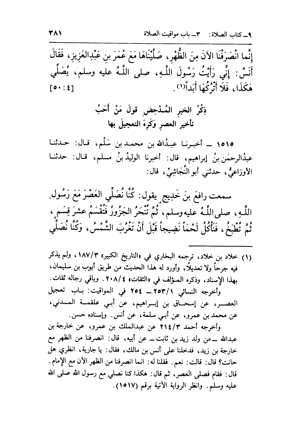 إِنَّمَا انْصَرَفْنَا الْآنَ مِنَ الظُّهْرِ صَلَّيْنَاهَا مَعَ عُمَرَ بْنِ عَبْدِ الْعَزِيزِ فَقَالَ أَنَسٌ إِنِّي رَأَيْتُ رَسُولَ اللَّهِ صَلَّى اللَّهُ عَلَيْهِ وَسَلَّمَ يصلي هكذا فلا أتركها أبدا1.