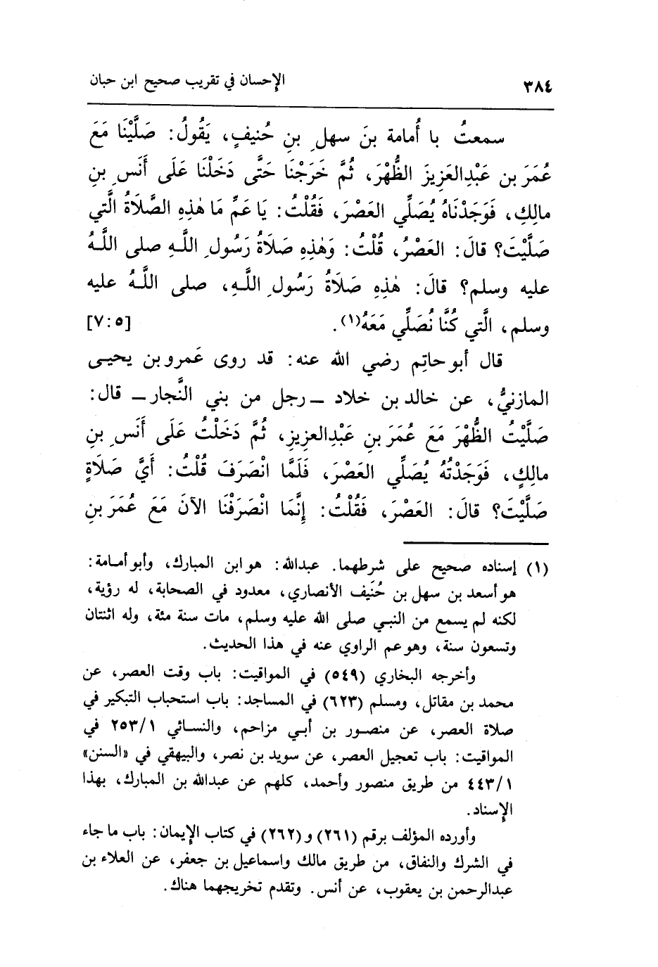 سَمِعْتُ أَبَا أُمَامَةَ بْنَ سَهْلِ بْنِ حُنَيْفٍ يَقُولُ: صَلَّيْنَا مَعَ عُمَرَ بْنِ عَبْدِ الْعَزِيزِ الظُّهْرَ ثُمَّ خَرَجْنَا حَتَّى دَخَلْنَا عَلَى أَنَسِ بْنِ مَالِكٍ فَوَجَدْنَاهُ يُصَلِّي الْعَصْرَ فَقُلْتُ يَا عَمُّ مَا هَذِهِ الصَّلَاةُ الَّتِي صَلَّيْتَ؟ قَالَ: الْعَصْرُ قُلْتُ وَهَذِهِ صَلَاةُ رَسُولِ اللَّهِ صَلَّى اللَّهُ عَلَيْهِ وَسَلَّمَ قَالَ: هَذِهِ صَلَاةُ رَسُولِ اللَّهِ صَلَّى اللَّهُ عَلَيْهِ وَسَلَّمَ الَّتِي كُنَّا نصلي معه1.