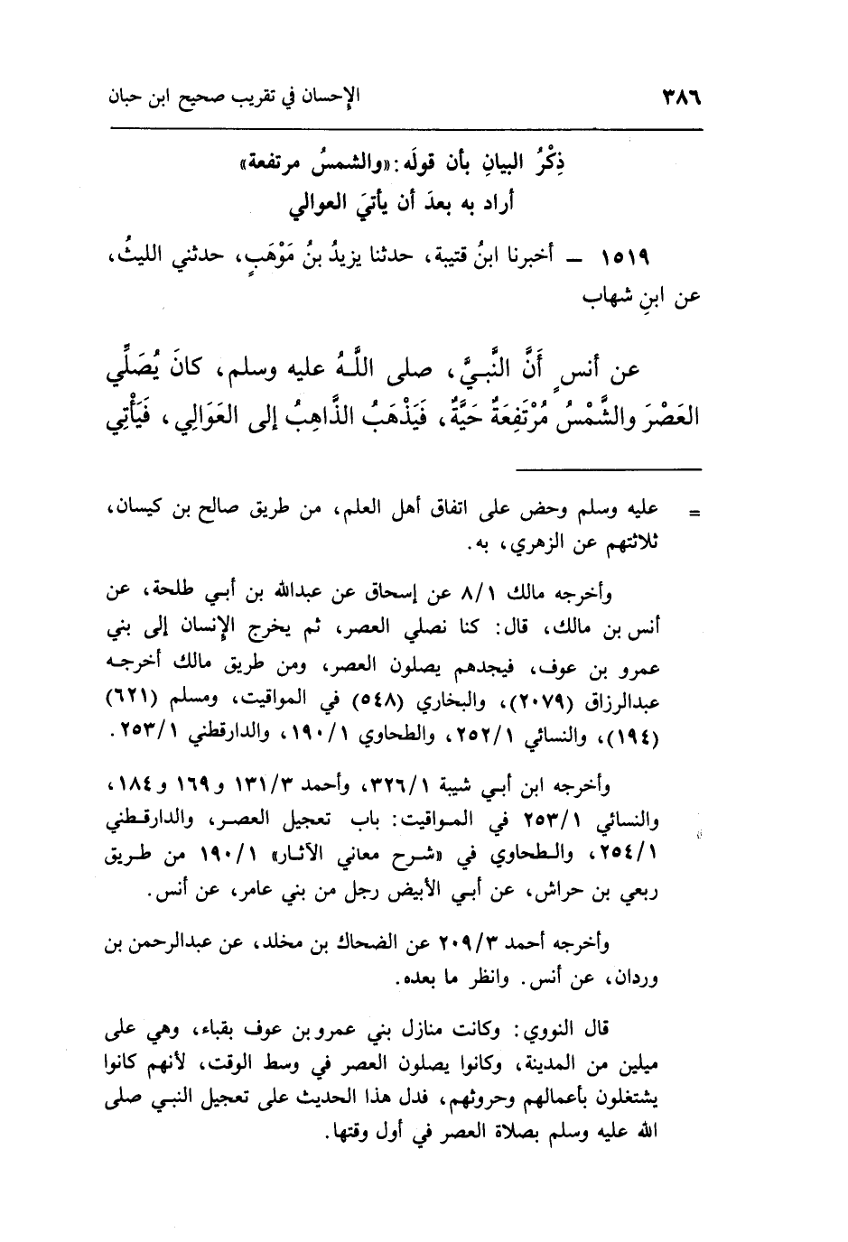وأخرجه مالك 1/8 عن إسحاق عن عبد الله بن أبي طلحة، عن أنس بن مالك، قال: كنا نصلي العصر، ثم يخرج الإنسان إلى بني عمرو بن عوف، فيجدهم يصلون العصر، ومن طريق مالك أخرجه عبد الرزاق [2079] ، والبخاري [548] في المواقيت، ومسلم [621] [194] ، والنسائي 1/252، والطحاوي 1/190، والدارقطني 1/253.