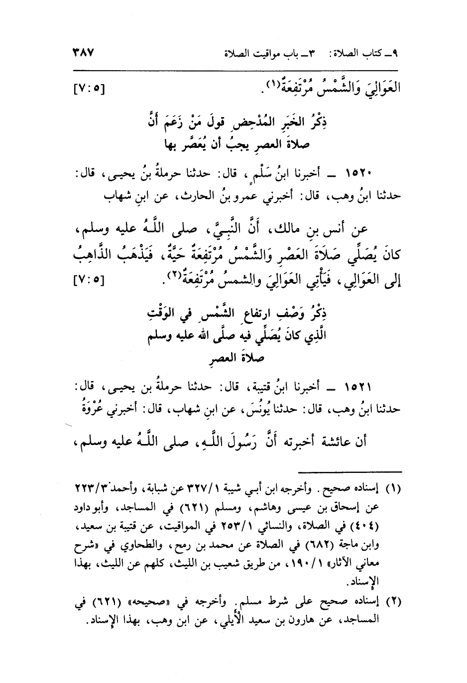 عَنْ أَنَسِ بْنِ مَالِكٍ أَنَّ النَّبِيَّ صَلَّى اللَّهُ عَلَيْهِ وَسَلَّمَ كَانَ يُصَلِّي صَلَاةَ الْعَصْرِ وَالشَّمْسُ مُرْتَفِعَةٌ حَيَّةٌ فَيَذْهَبُ الذَّاهِبُ إلى العوالي فيأتي العوالي والشمس مرتفعة1.