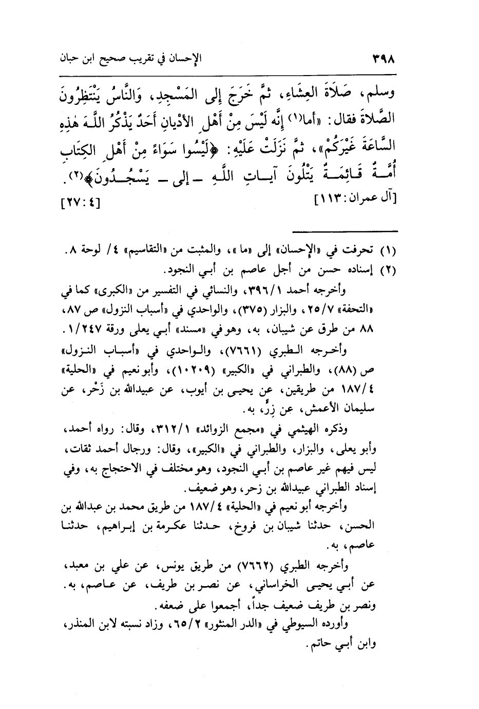 وَسَلَّمَ صَلَاةَ الْعِشَاءِ ثُمَّ خَرَجَ إِلَى الْمَسْجِدِ وَالنَّاسُ يَنْتَظِرُونَ الصَّلَاةَ فَقَالَ: "أَمَا1 إِنَّهُ لَيْسَ مِنْ أَهْلِ الْأَدْيَانِ أَحَدٌ يَذْكُرُ اللَّهَ هَذِهِ السَّاعَةَ غَيْرُكُمْ"، ثُمَّ نَزَلَتْ عَلَيْهِ {لَيْسُوا سَوَاءً مِنْ أَهْلِ الْكِتَابِ أُمَّةٌ قَائِمَةٌ يَتْلُونَ آيَاتِ اللَّهِ} إلى {يَسْجُدُونَ} 2 [آل عمران: 113] .