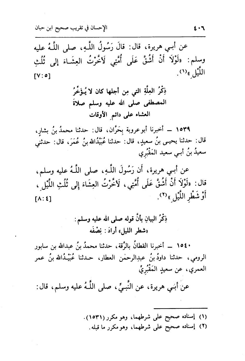 عَنْ أَبِي هُرَيْرَةَ أَنَّ رَسُولَ اللَّهِ صَلَّى اللَّهُ عَلَيْهِ وَسَلَّمَ قَالَ: "لَوْلَا أَنْ أَشُقَّ عَلَى أُمَّتِي لَأَخَّرْتُ الْعِشَاءَ إلى ثلث الليل أو شطر الليل" 1.