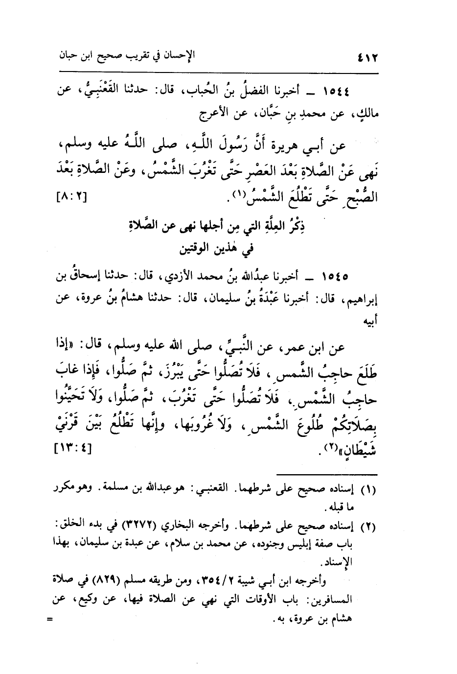 عَنْ بن عُمَرَ عَنِ النَّبِيِّ صَلَّى اللَّهُ عَلَيْهِ وَسَلَّمَ قَالَ: "إِذَا طَلَعَ حَاجِبُ الشَّمْسِ فَلَا تُصَلُّوا حَتَّى يَبْرُزَ ثُمَّ صَلُّوا فَإِذَا غَابَ حَاجِبُ الشَّمْسِ فَلَا تُصَلُّوا حَتَّى تَغْرُبَ ثُمَّ صَلُّوا وَلَا تَحَيَّنُوا بِصَلَاتِكُمْ طُلُوعَ الشَّمْسِ وَلَا غُرُوبَهَا وإنها تطلع بين قرني شيطان" 1.