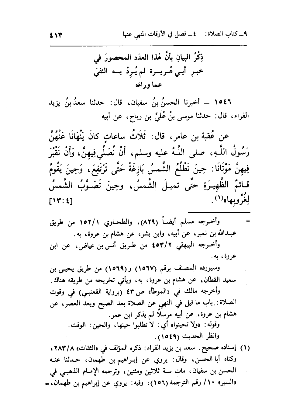 عَنْ عُقْبَةَ بْنِ عَامِرٍ قَالَ ثَلَاثُ سَاعَاتٍ كَانَ يَنْهَانَا عَنْهُنَّ رَسُولُ اللَّهِ صَلَّى اللَّهُ عَلَيْهِ وَسَلَّمَ أَنْ نُصَلِّيَ فِيهِنَّ وَأَنْ نَقْبُرَ فِيهِنَّ مَوْتَانَا حِينَ تَطْلُعُ الشَّمْسُ بَازِغَةً حَتَّى تَرْتَفِعَ وَحِينَ يَقُومُ قَائِمُ الظَّهِيرَةِ حَتَّى تَمِيلَ الشمس وحين تصوب الشمس لغروبها1.