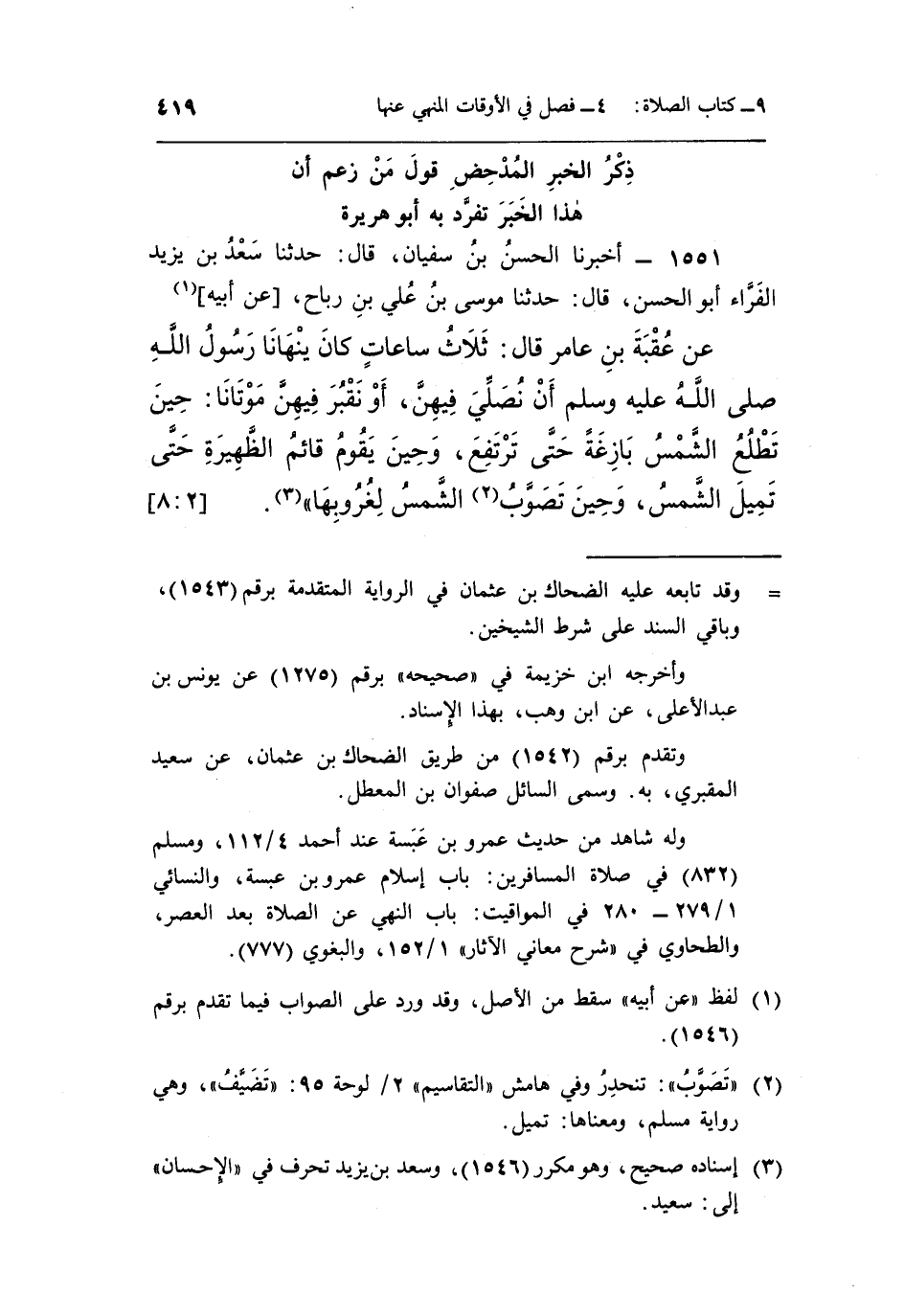 عَنْ عُقْبَةَ بْنِ عَامِرٍ قَالَ ثَلَاثُ سَاعَاتٍ كَانَ يَنْهَانَا رَسُولُ اللَّهِ صَلَّى اللَّهُ عَلَيْهِ وَسَلَّمَ أَنْ نُصَلِّيَ فِيهِنَّ أَوْ نَقْبُرَ فِيهِنَّ مَوْتَانَا حِينَ تَطْلُعُ الشَّمْسُ بَازِغَةً حَتَّى تَرْتَفِعَ وَحِينَ يَقُومُ قَائِمُ الظَّهِيرَةِ حَتَّى تَمِيلَ الشَّمْسُ وَحِينَ تصوب2 الشمس لغروبها"3.