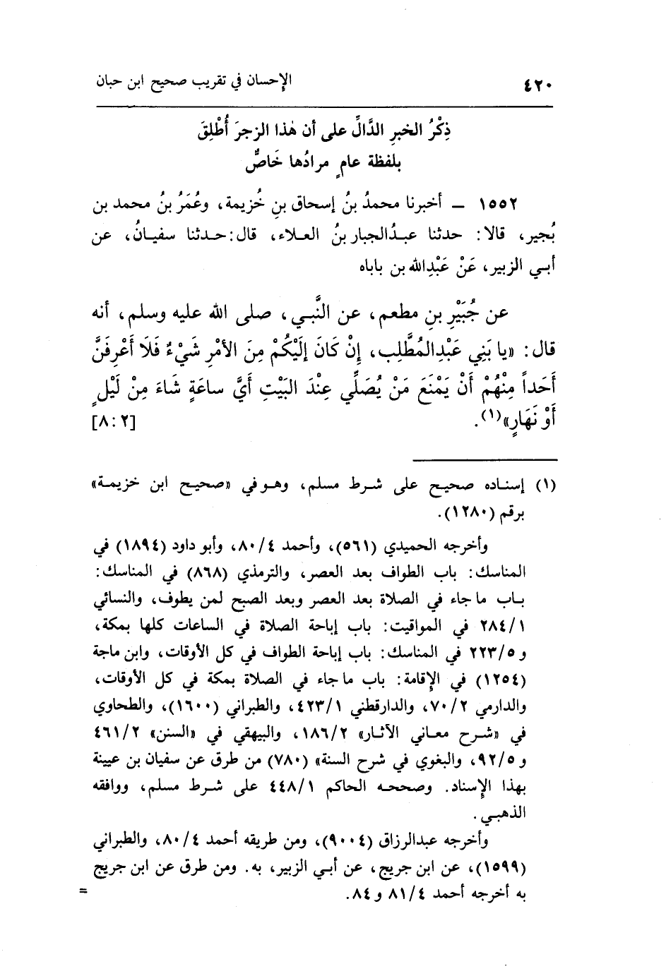 وأخرجه الحميدي [561] ، وأحمد 4/80، وأبو داود [1894] في المناسك: باب الطواف بعد العصر، والترمذي [868] في المناسك: باب ما جاء في الصلاة بعد العصر وبعد الصبح لمن يطوف، والنسائي 1/284 في المواقيت: باب إباحة الصلاة في الساعات كلها بمكة، و5/223 في المناسك: باب إباحة الطواف في كل الأوقات، وابن ماجة [1254] في الإقامة: باب ماجاء في الصلاة بمكة في كل الأوقات، والدارمي 2/70، والدارقطني 1/423، والطبراني [1600] ، والطحاوي في "شرح معاني الآثار" 2/186، والبيهقي في "السنن" 2/461 و5/92، والبغوي في شرح السنة [780] من طرق عن سفيان بن عيينة بهذا الإسناد. وصححه الحاكم 1/448 على شرط مسلم، ووافقه الذهبي.