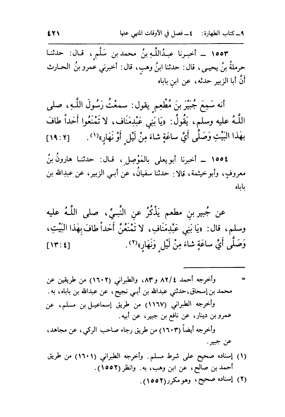 عَنْ جُبَيْرِ بْنِ مُطْعِمٍ يَذْكُرُ عَنِ النَّبِيِّ صَلَّى اللَّهُ عَلَيْهِ وَسَلَّمَ قَالَ: "يا بَنِي عَبْدِ مَنَافٍ لَا تَمْنَعُنَّ أَحَدًا طَافَ بِهَذَا الْبَيْتِ وَصَلَّى أَيَّ سَاعَةٍ شَاءَ مِنْ ليل ونهار" 2.