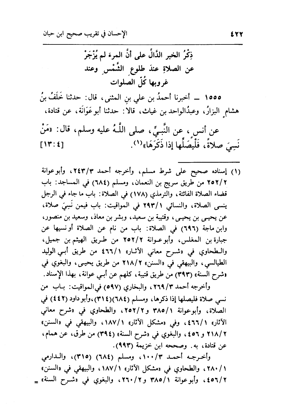 وأخرجه أحمد 3/269، والبخاري [597] في المواقيت: باب من نسي صلاة فليصلها إذا ذكرها، ومسلم [684] [314] ، وأبو داود [442] في الصلاة، وأبو عوانة 1/385 و2/252، والطحاوي في "شرح معاني الآثار" 1/466، وفي "مشكل الآثار" 1/187، والبيهقي في "السنن" 2/218 و456، والبغوي في "شرح السنة" [394] من طرق، عن همام، عن قتادة، به. وصححه ابن خزيمة [993] .