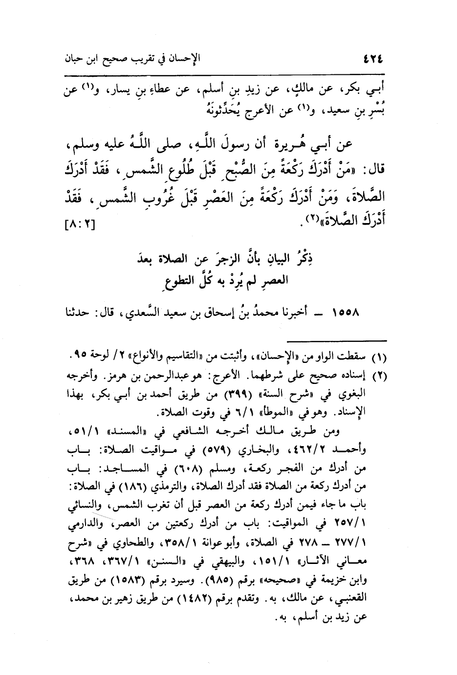 ومن طريق مالك أخرجه الشافعي في "المسند" 1/51، وأحمد 2/462، والبخاري [579] في مواقيت الصلاة: باب من أدرك من الفجر ركعة، ومسلم [608] في المساجد: باب من أدرك ركعة من الصلاة فقد أدرك الصلاة، والترمذي [186] في الصلاة: باب ما جاء فيمن أدرك ركعة من العصر قبل أتغرب الشمس، والنسائي 1/257 في المواقيت: باب من أدرك ركعتين من العصر، والدارمي 1/277-287 في الصلاة، وأبو عوانة 1/358، والطحاوي في "شرح معاني الآثار" 1/151، والبيهقي في "السنن" 1/367، 368، وابن خزيمة في "صحيحه" برقم [985] . وسيرد برقم [1583] من طريق القعنبي، عن مالك، به. وتقدم برقم [1482] من طريق زهير بن محمد، عن زيد بن أسلم، به.