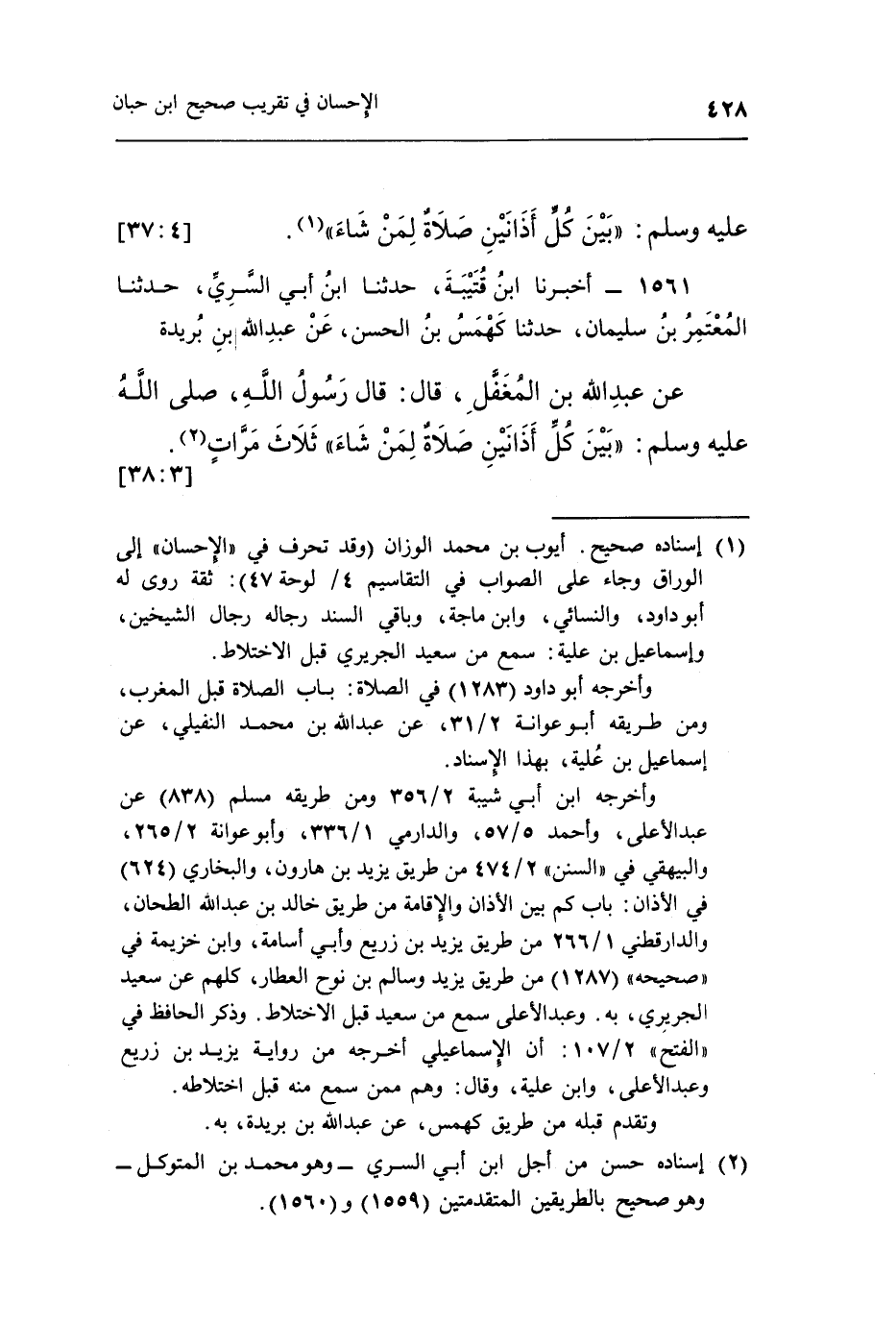 وأخرجه أبو داود [1283] في الصلاة: باب الصلاة قبل المغرب، ومن طريقه أبو عوانة 2/31، عن عبد الله بن محمد النفيلي، عن إسماعيل بن علية، بهذا الإسناد.