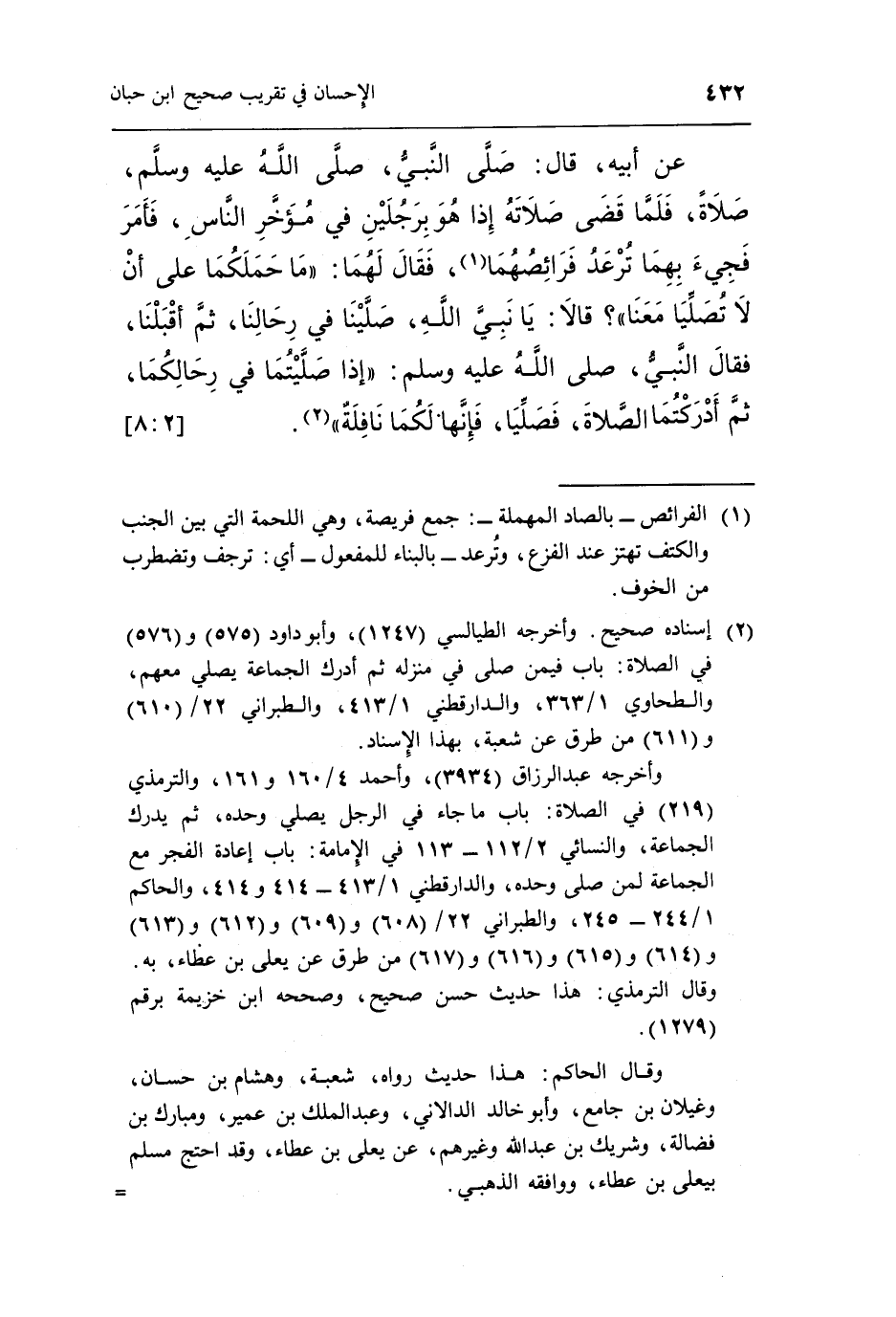 وأخرجه عبد الرزاق [3934] ، وأحمد 4/160 و161، والترمذي [219] في الصلاة: باب ما جاء في الرجل يصلي وحده، ثم يدرك الجماعة، والنسائي 2/112- 113 في الإمامة: باب إعادة الفجر مع الجماعة لمن صلى وحده، والدارقطني 1/413 -414 و414، والحاكم 1/244 -245، والطبراني 22/ [608] و [609] و [612] و [613] و [614] و [615] و [616] و [617] من طرق عن يعلى بن عطاء، به. وقال الترمذي: هذا حديث حسن صحيح، وصححه ابن خزيمة برقم [1279] .