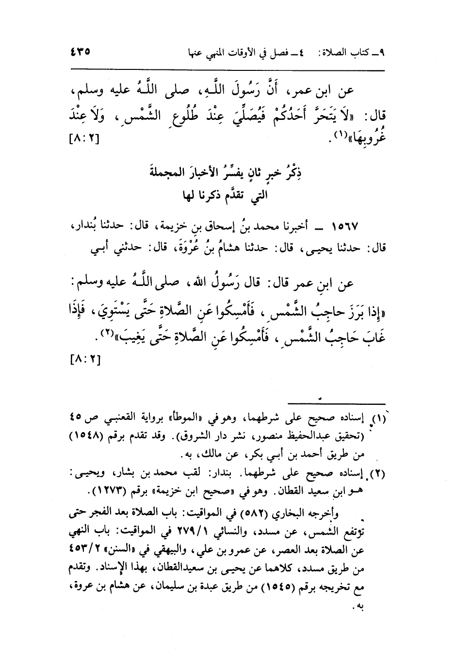 عَنِ ابْنِ عُمَرَ قَالَ قَالَ رَسُولُ اللَّهِ صلى الله عليه وسلم: "إذا بَرَزَ حَاجِبُ الشَّمْسِ فَأَمْسِكُوا عَنِ الصَّلَاةِ حَتَّى يَسْتَوِيَ فَإِذَا غَابَ حَاجِبُ الشَّمْسِ فَأَمْسِكُوا عَنِ الصلاة حتى يغيب" 1.