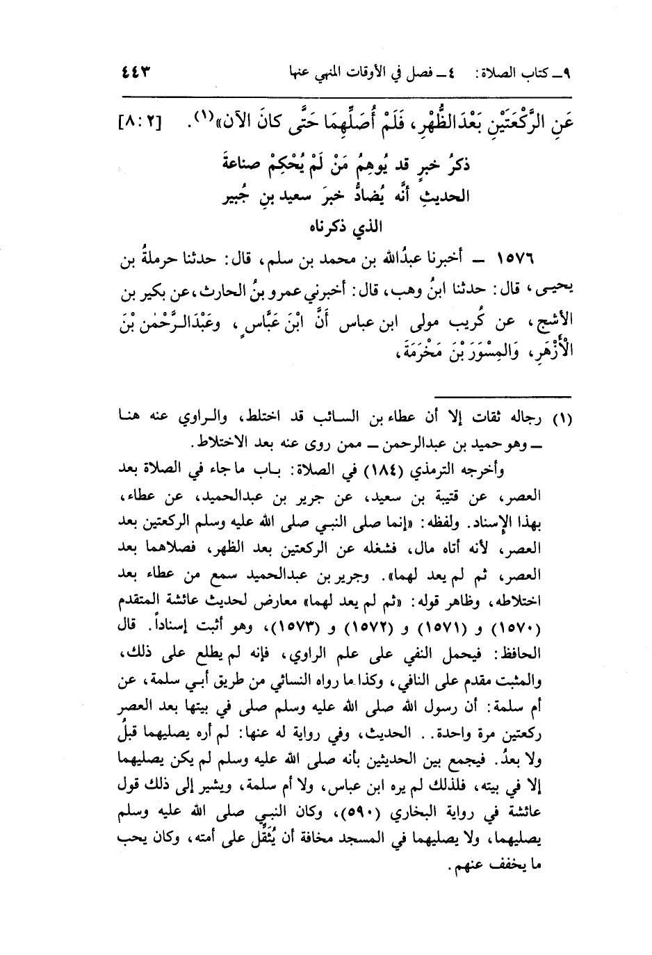1576 - أَخْبَرَنَا عَبْدُ اللَّهِ بْنُ مُحَمَّدِ بْنِ سَلْمٍ قَالَ حَدَّثَنَا حَرْمَلَةُ بْنُ يَحْيَى قَالَ حَدَّثَنَا بن وَهْبٍ قَالَ أَخْبَرَنِي عَمْرُو بْنُ الْحَارِثِ عَنْ بُكَيْرِ بْنِ الْأَشَجِّ عَنْ كُرَيْبٍ مَوْلَى ابْنِ عَبَّاسٍ أَنَّ ابْنَ عَبَّاسٍ وَعَبْدَ الرَّحْمَنِ بْنَ الْأَزْهَرِ وَالْمِسْوَرَ بْنَ مَخْرَمَةَ،